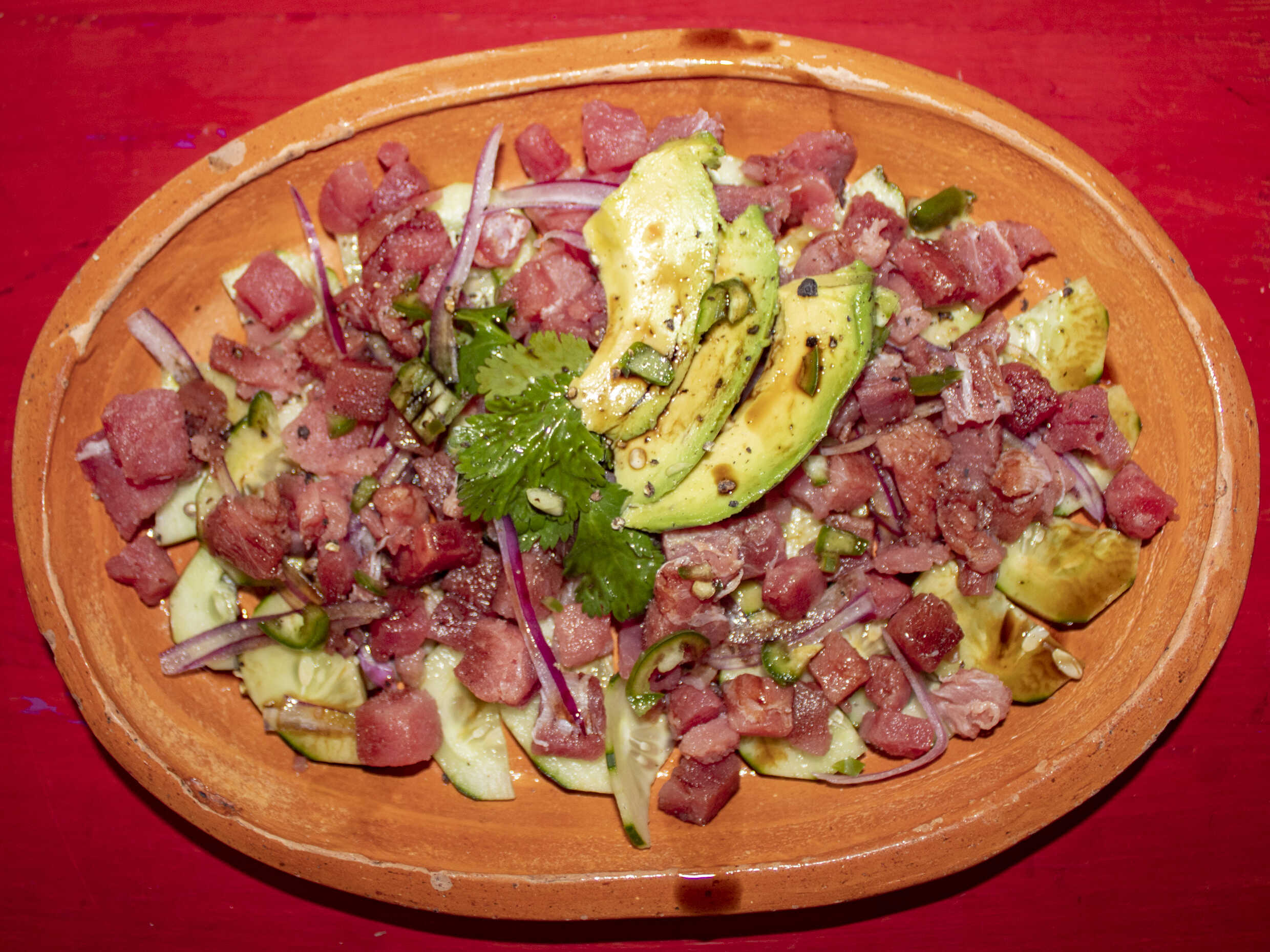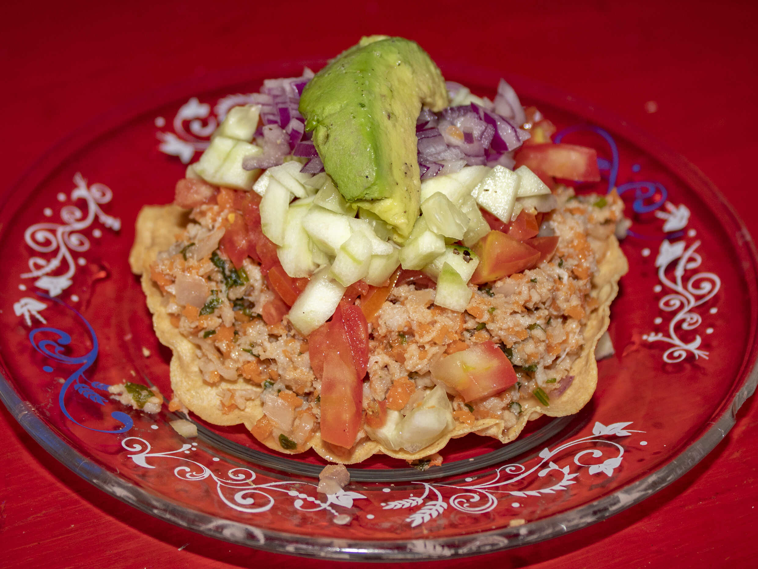 Tostada Atún con cebolla morada pepino con salsa