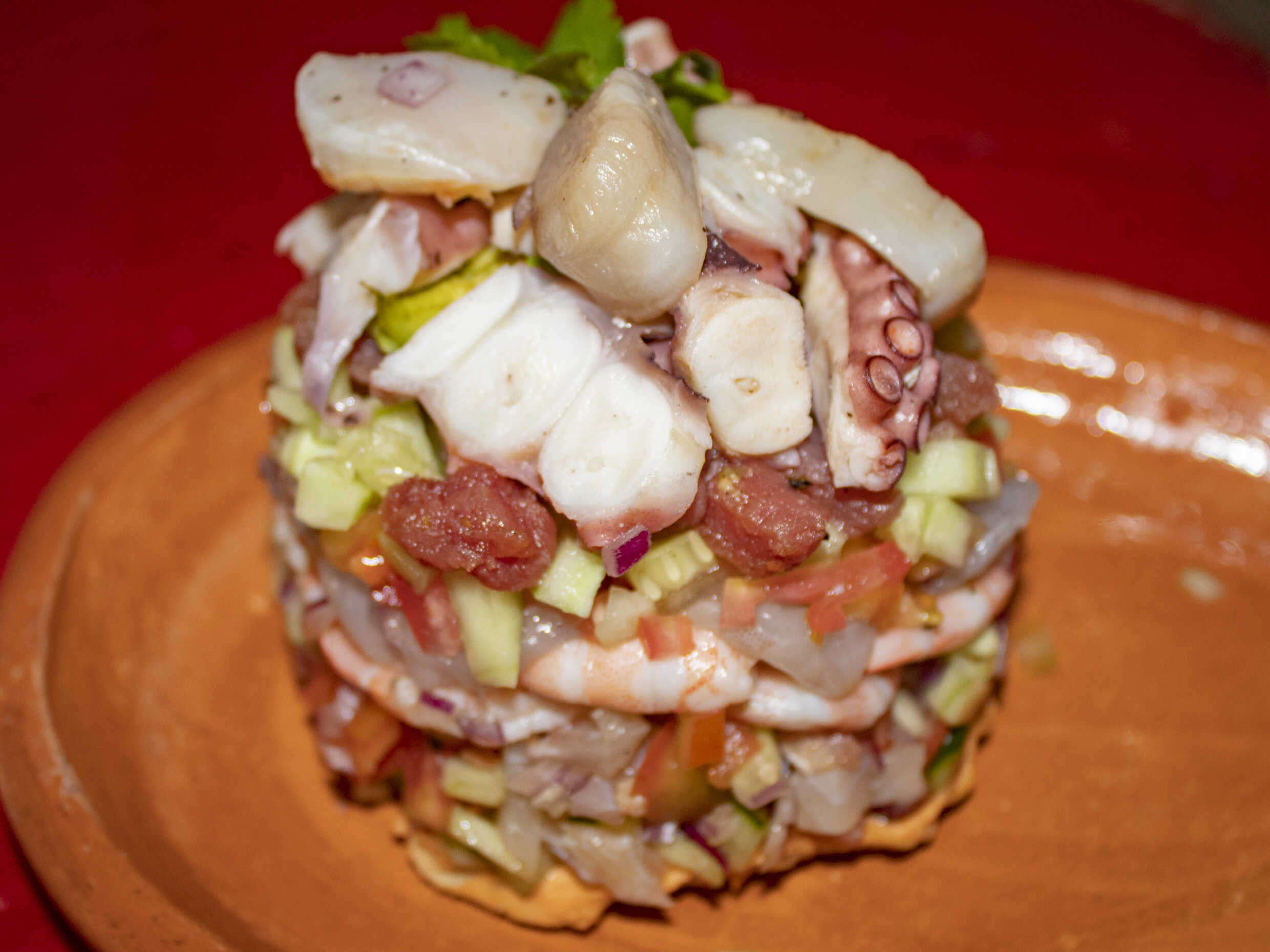 Camarón cocido y pulpo acompañado con jitomate, pepino y cebolla morada sazonadas.