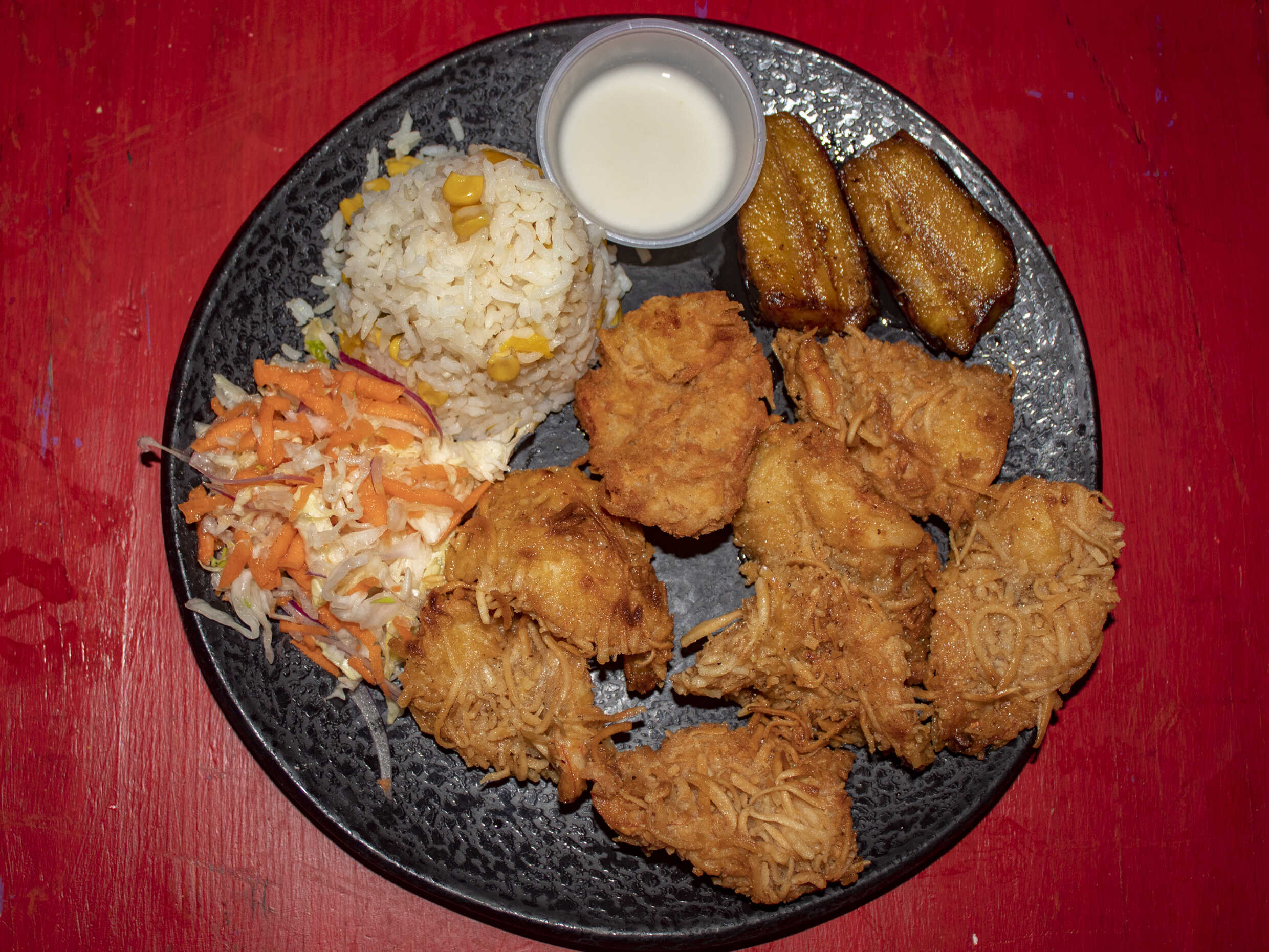 250 g De camarón, platillo de ensalada, arroz, crotón y platanito.