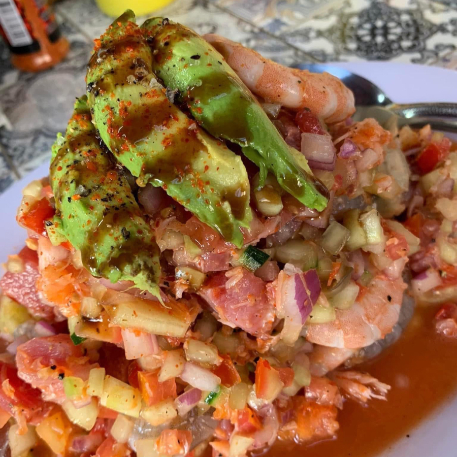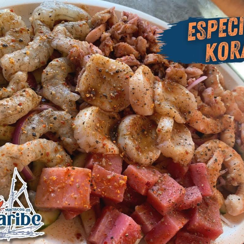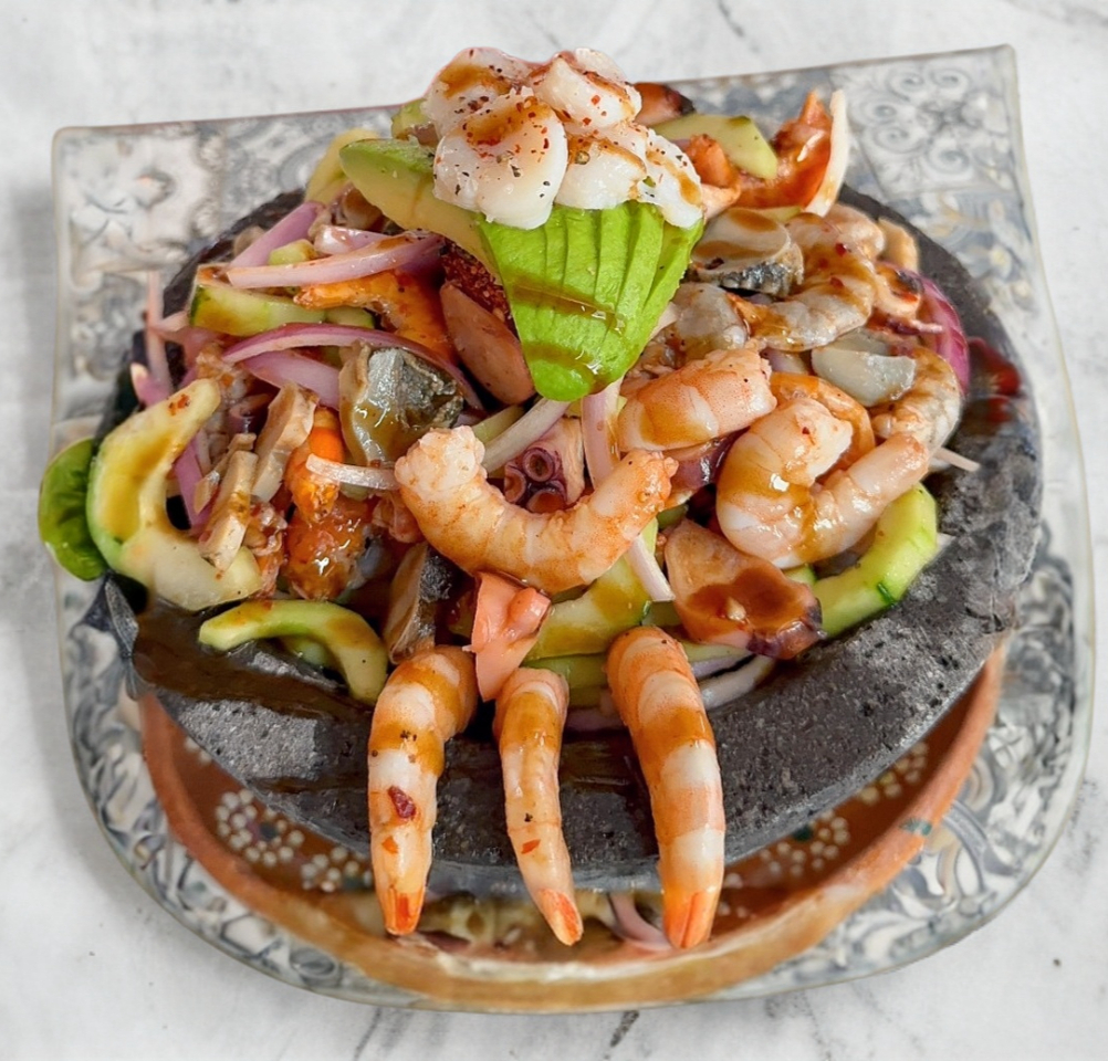 platillo preparado con variedad de mariscos (camaron cocido, camaron crudo, camaron seco, pulpo, caracol) bañado en salsa de la casa y preparado con pepino, cebolla y jitomate