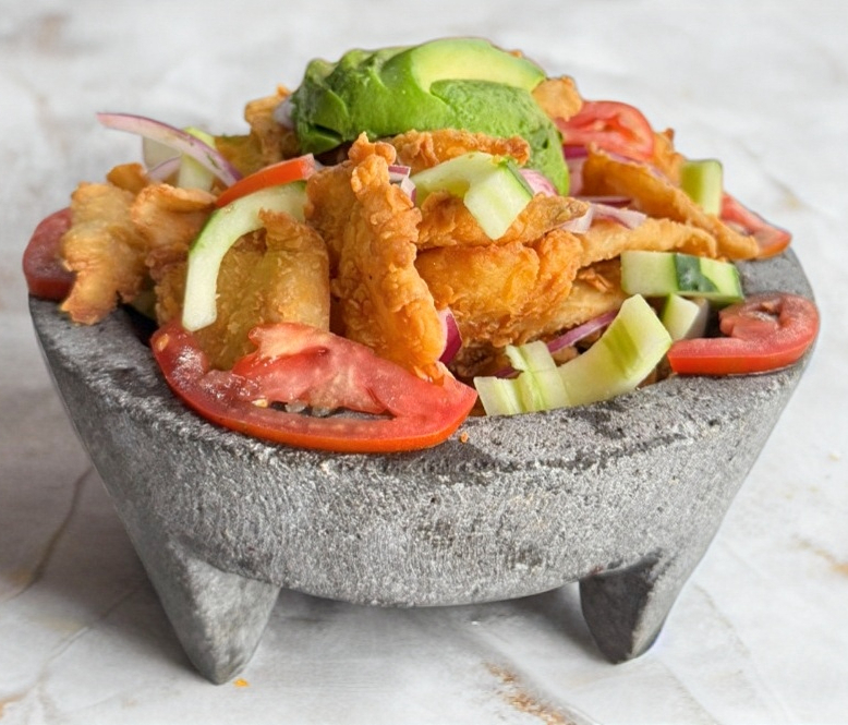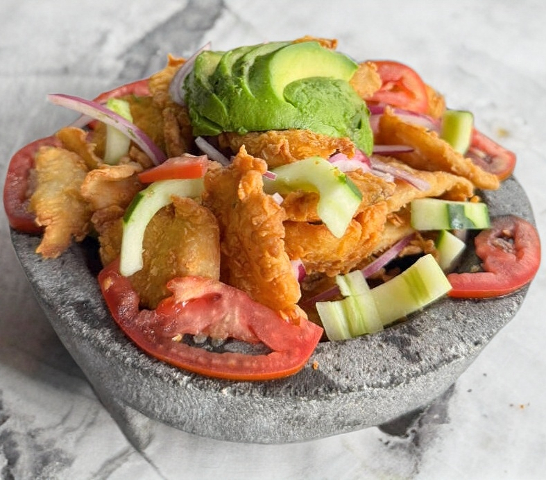 chicharron de pescado preparado con pepino y cebolla acompañado de tortillas
