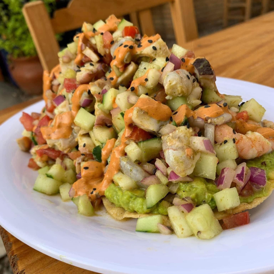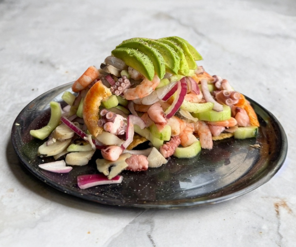 tostada de tamaño grande montada en una base de guacamole (el guacamole puede variar disponibilidad), preparada con camaron cocido, crudo y pulpo en trozos, verdura picada (pepino, cebolla y jitomate) bañada con aderezo