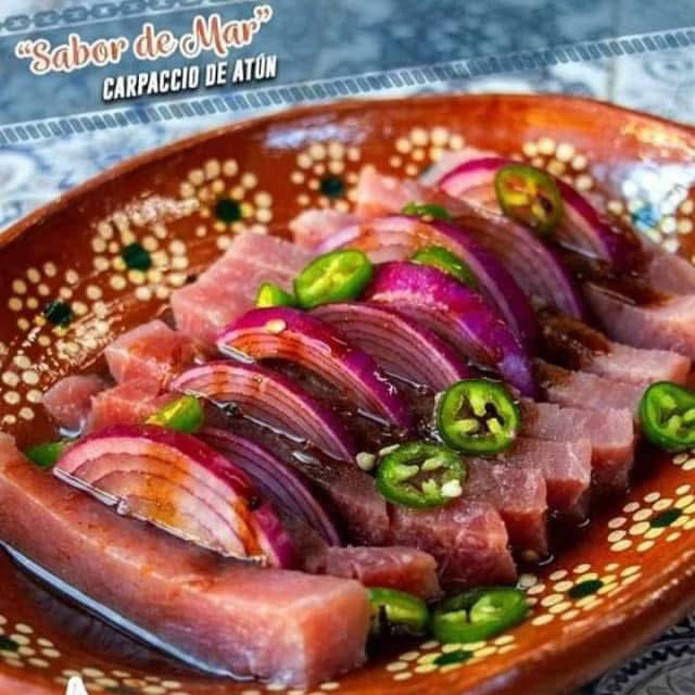 laminas de atún bañadas en salsa negra, acompañado de cebolla y rodajas de chile serrano