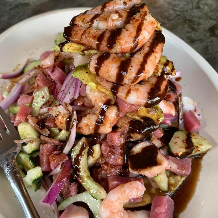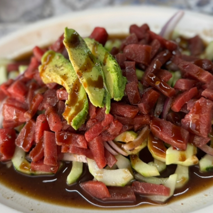 ensalada con camaron cocido, crudo, pulpo y atún en cuadros, bañada en salsas de la casa