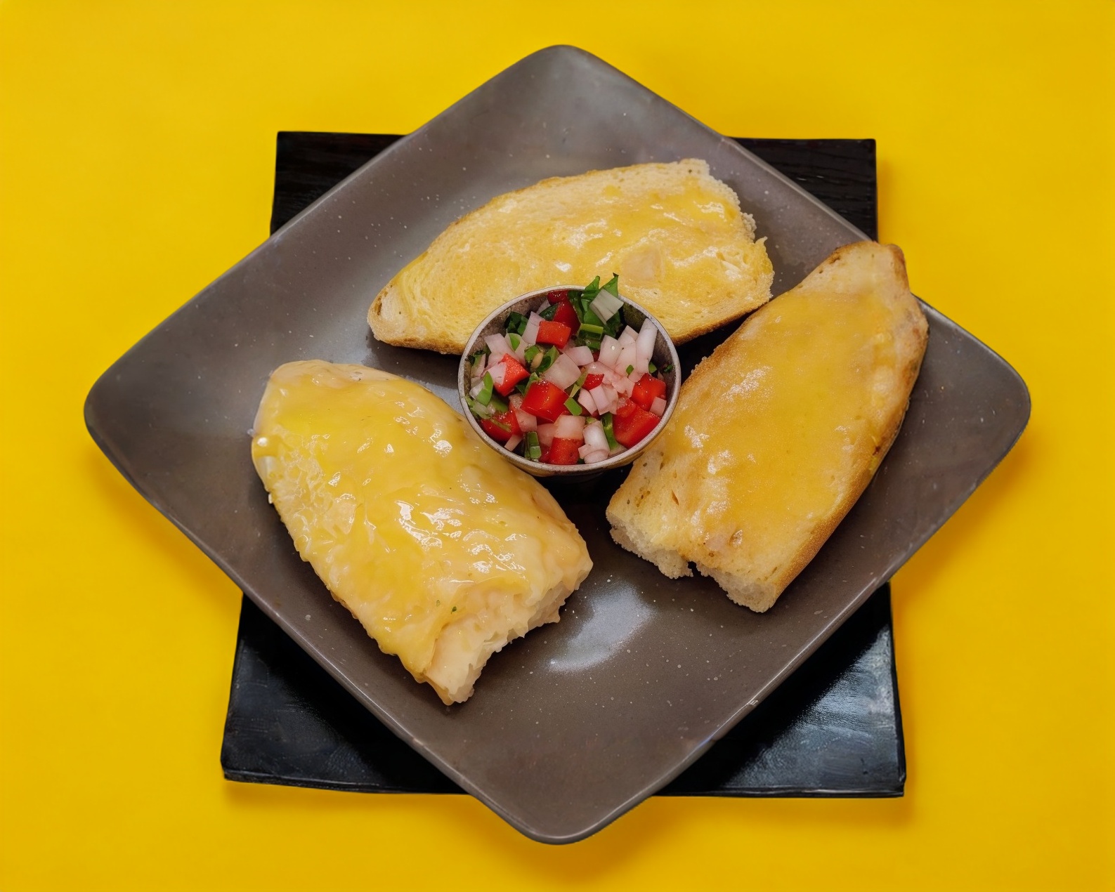 3 crujientes piezas de molletes de mantequilla y azúcar o frijoles con queso y salsita pico de gallo.
