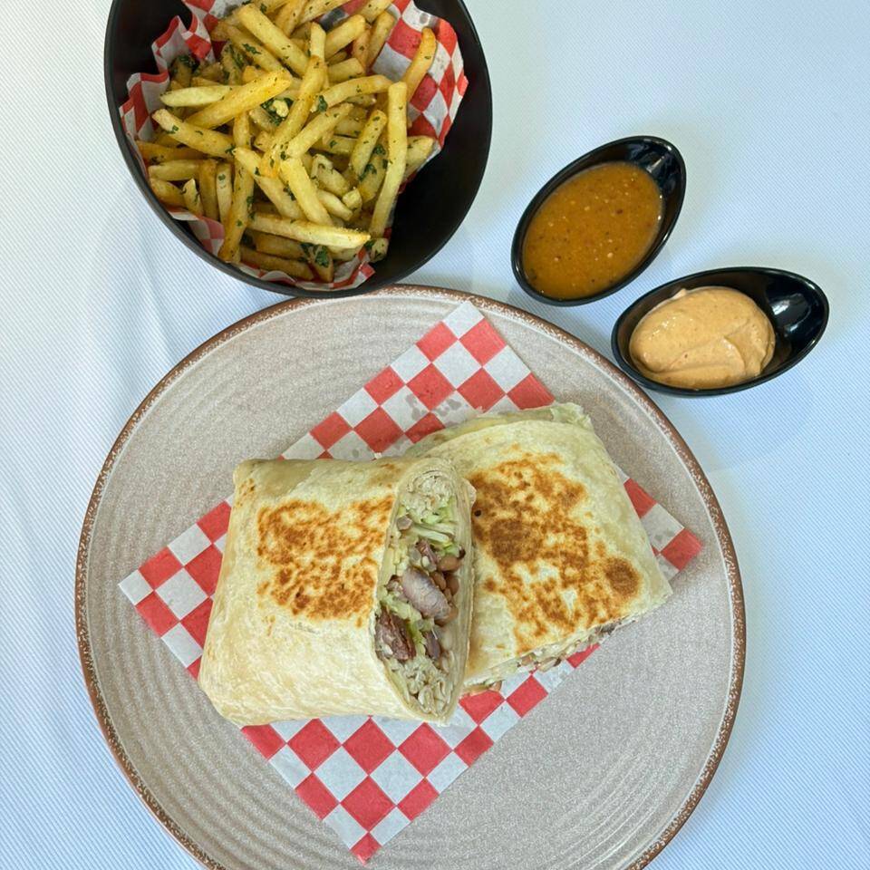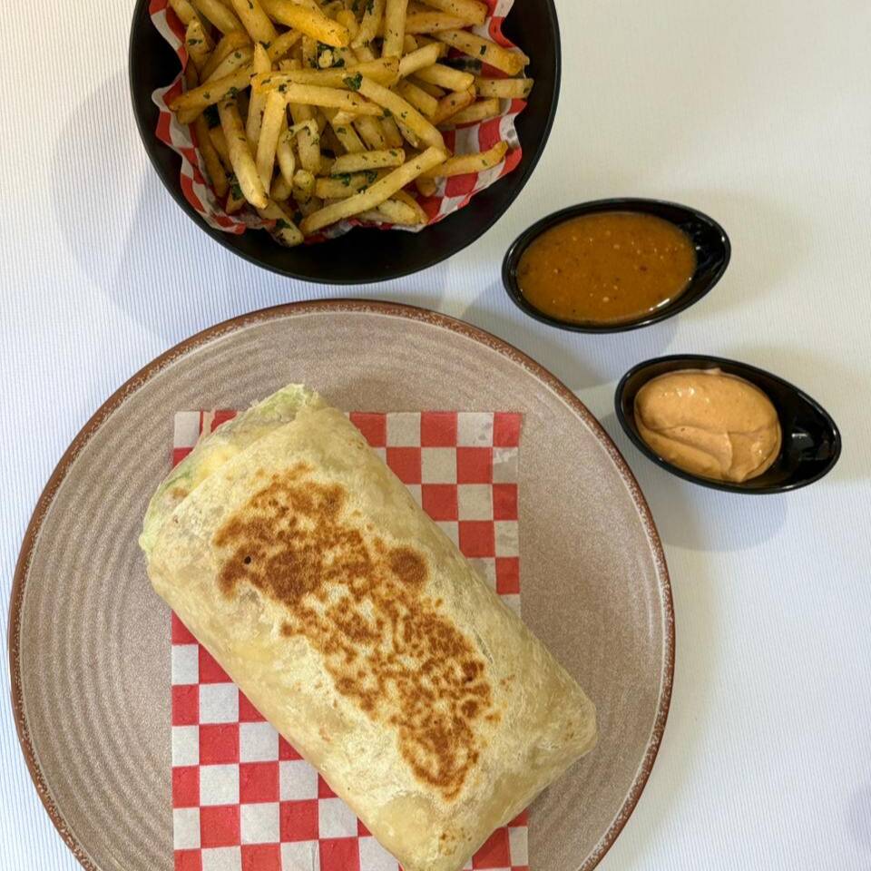 camaron, queso asadero, lechuga, cebolla, salsa chipotle y papas a la francesa