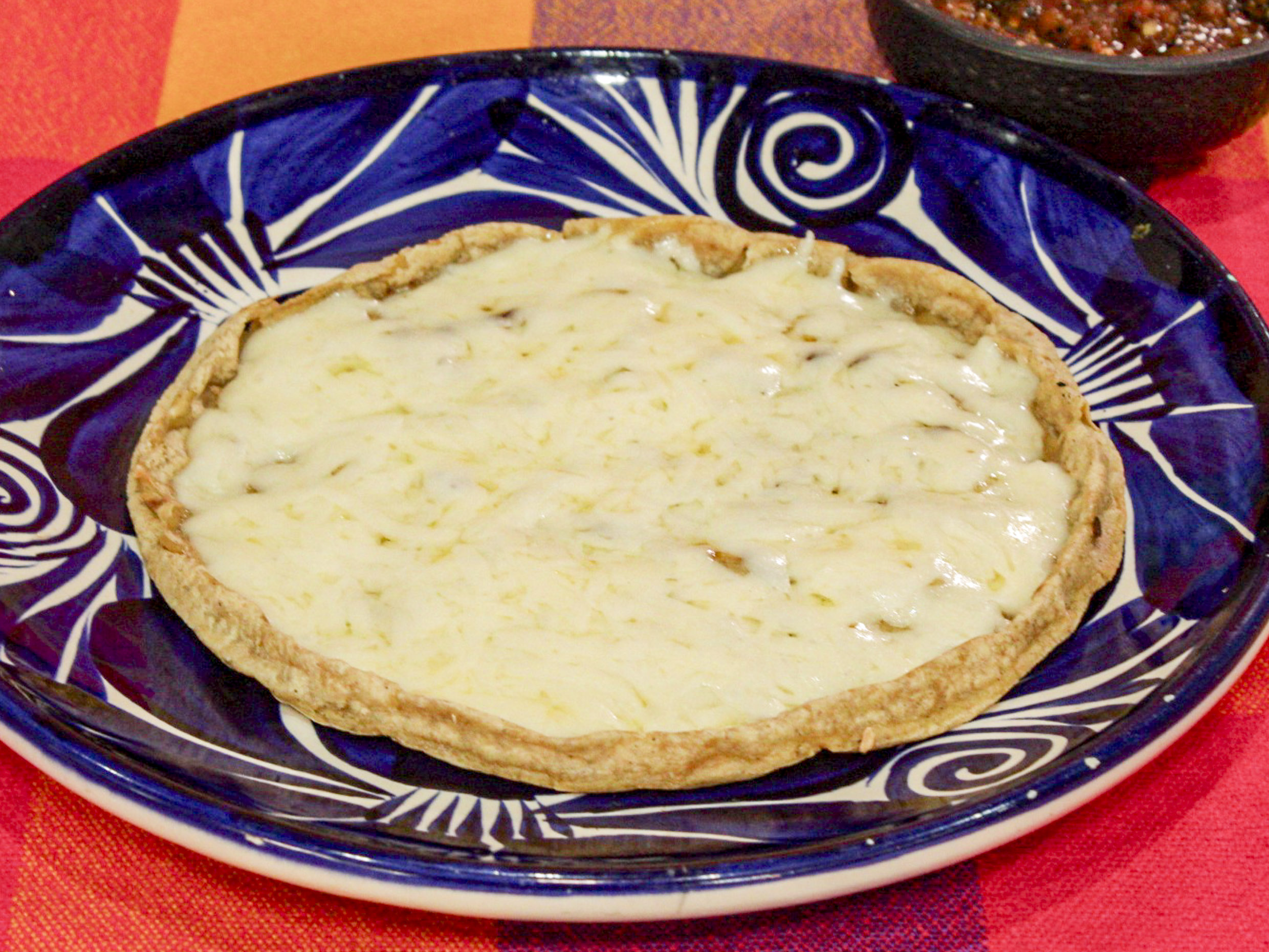 Tortilla de maíz, pellizcado en sus orilla, con queso derretido
