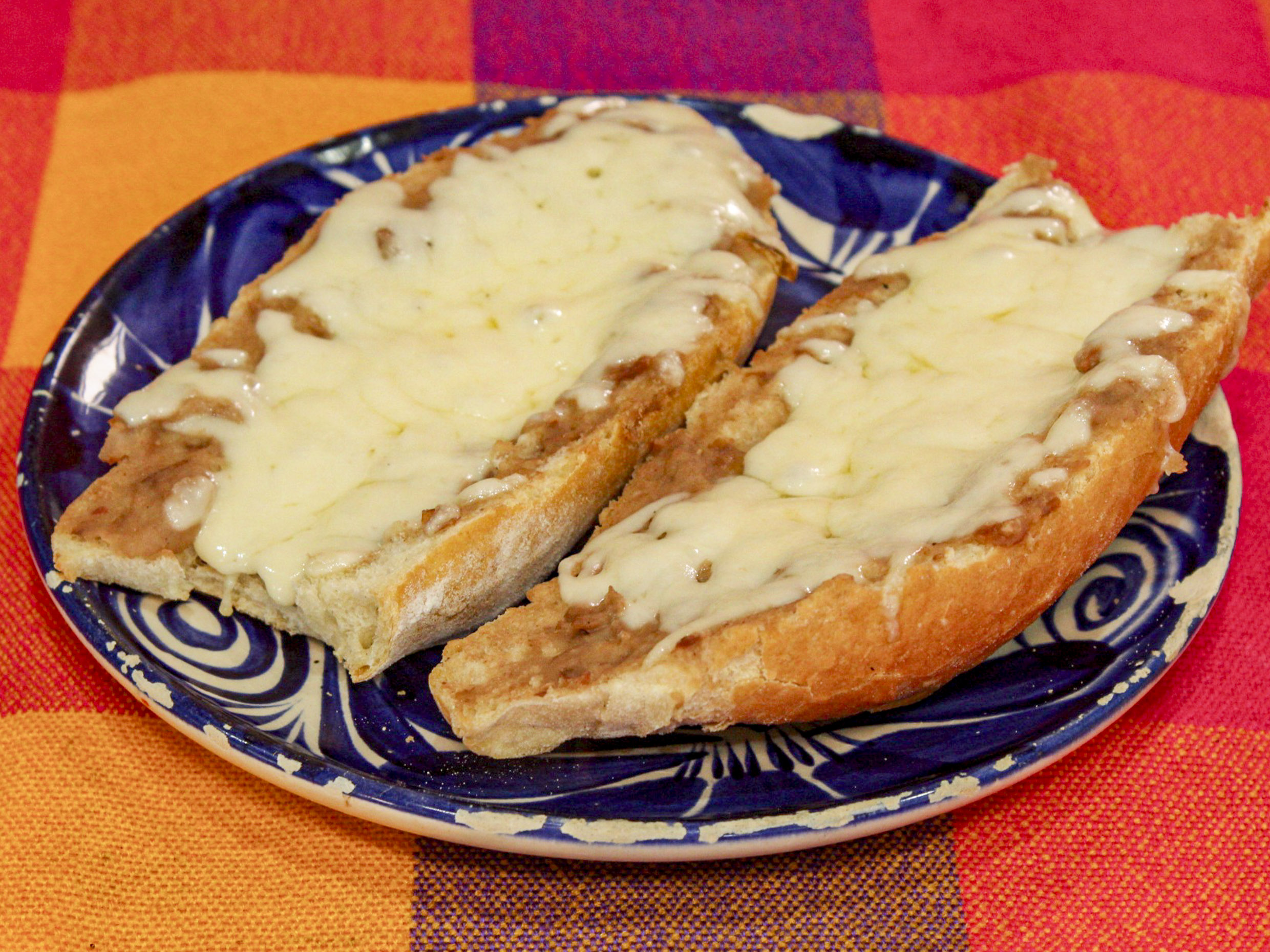 Bolillo partido a la mitad, Con frijoles y queso chédar horneado