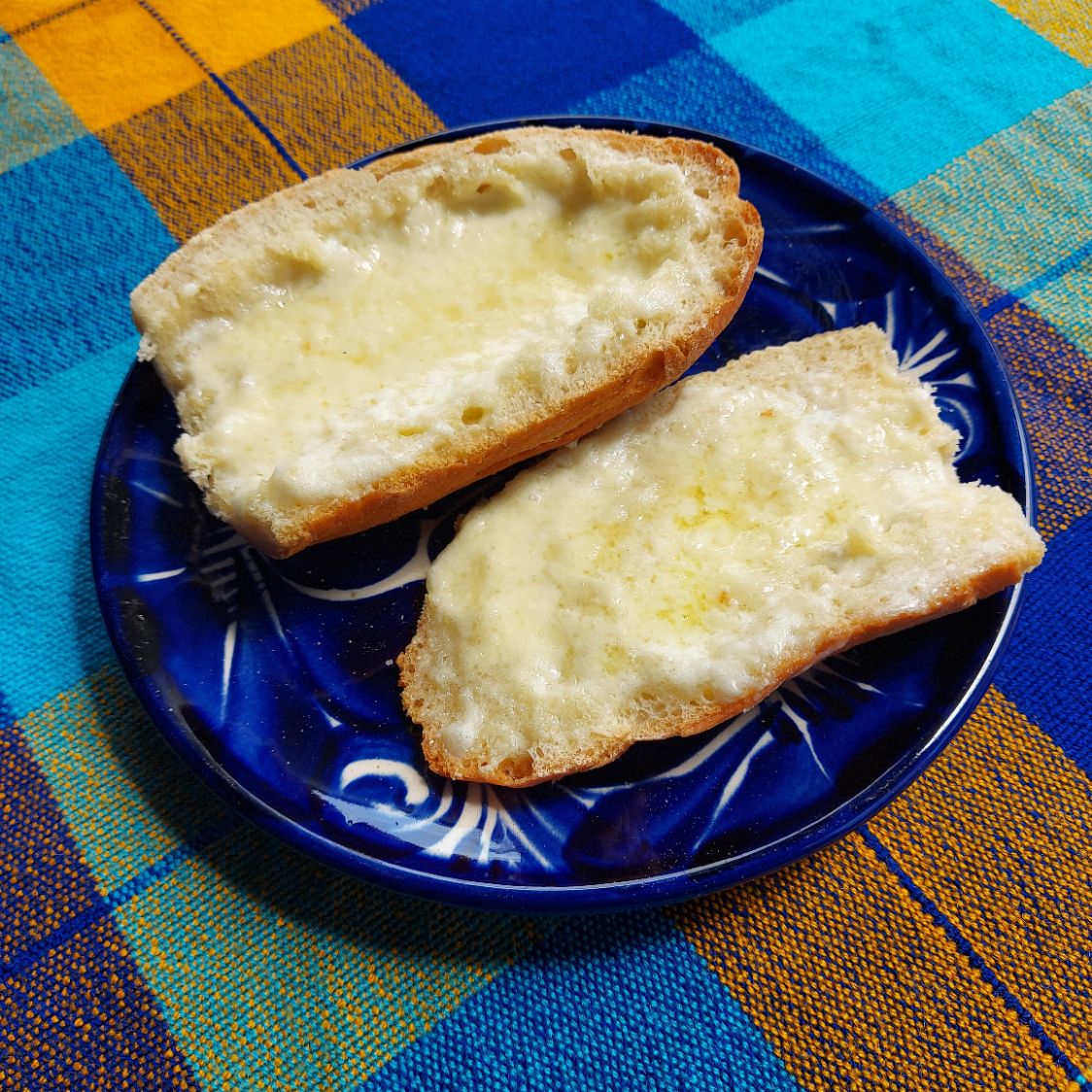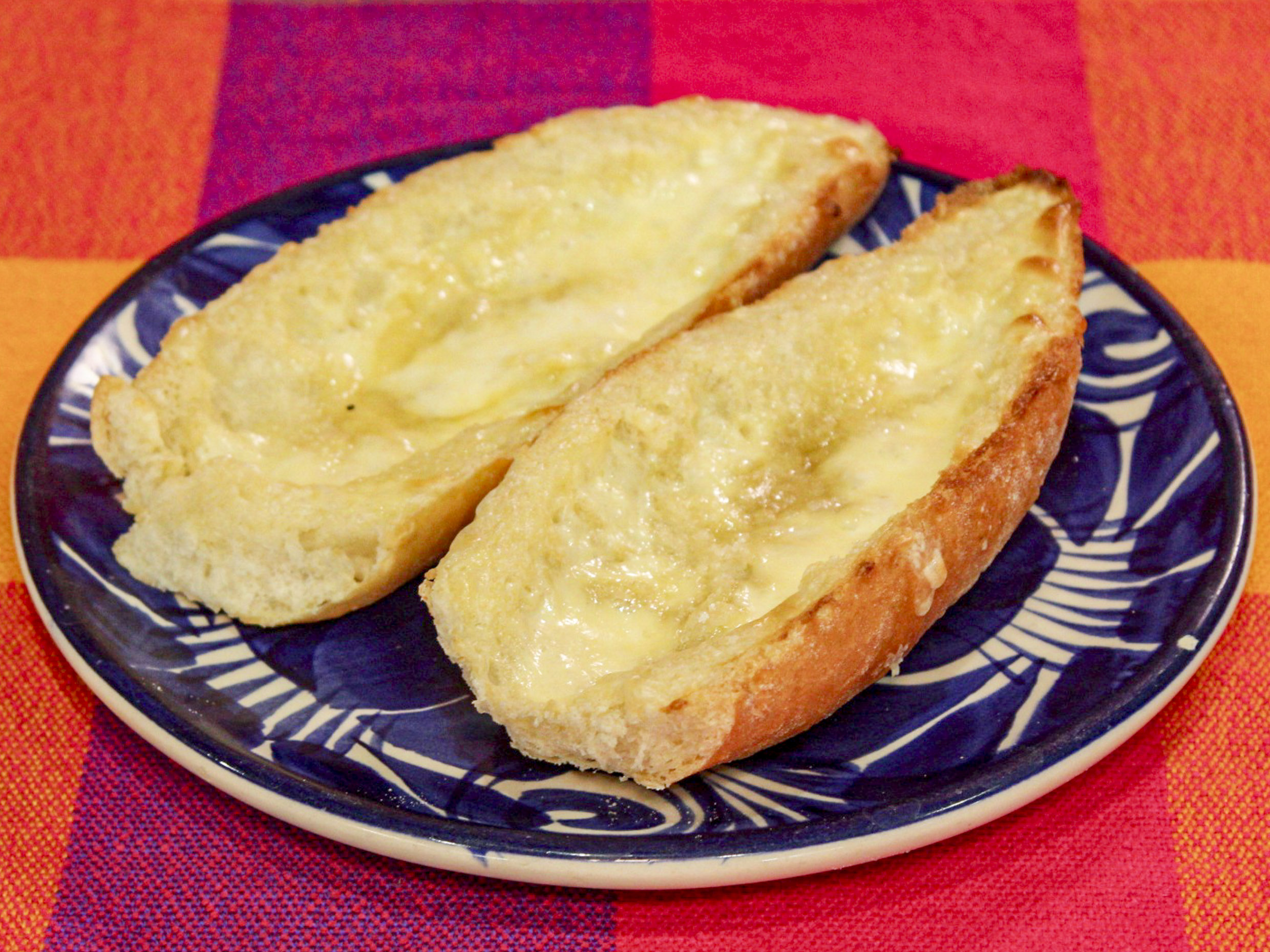 pan partido a la mitad, untado de mantequilla y horneado