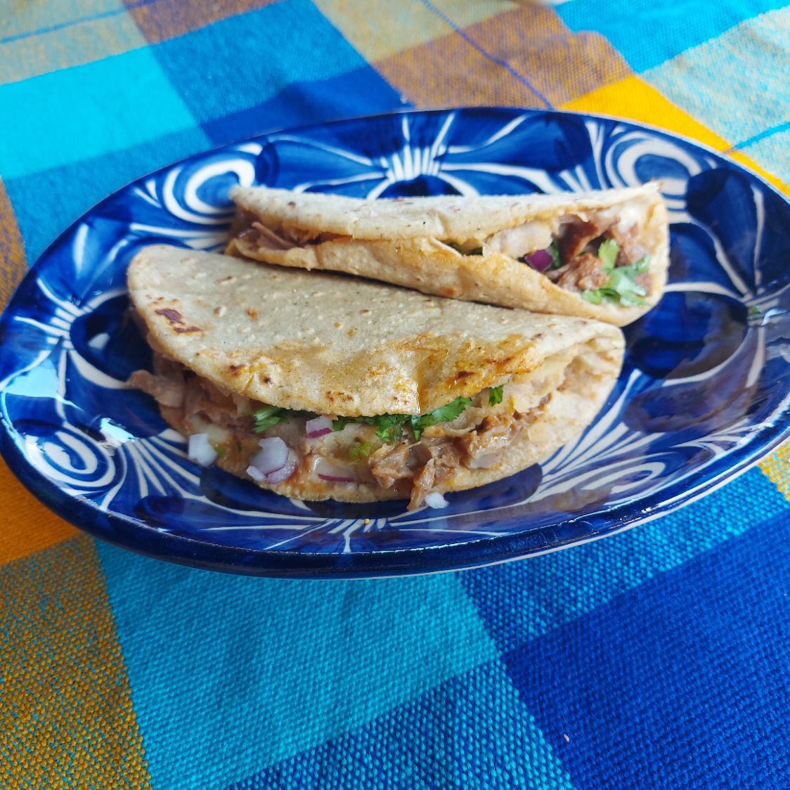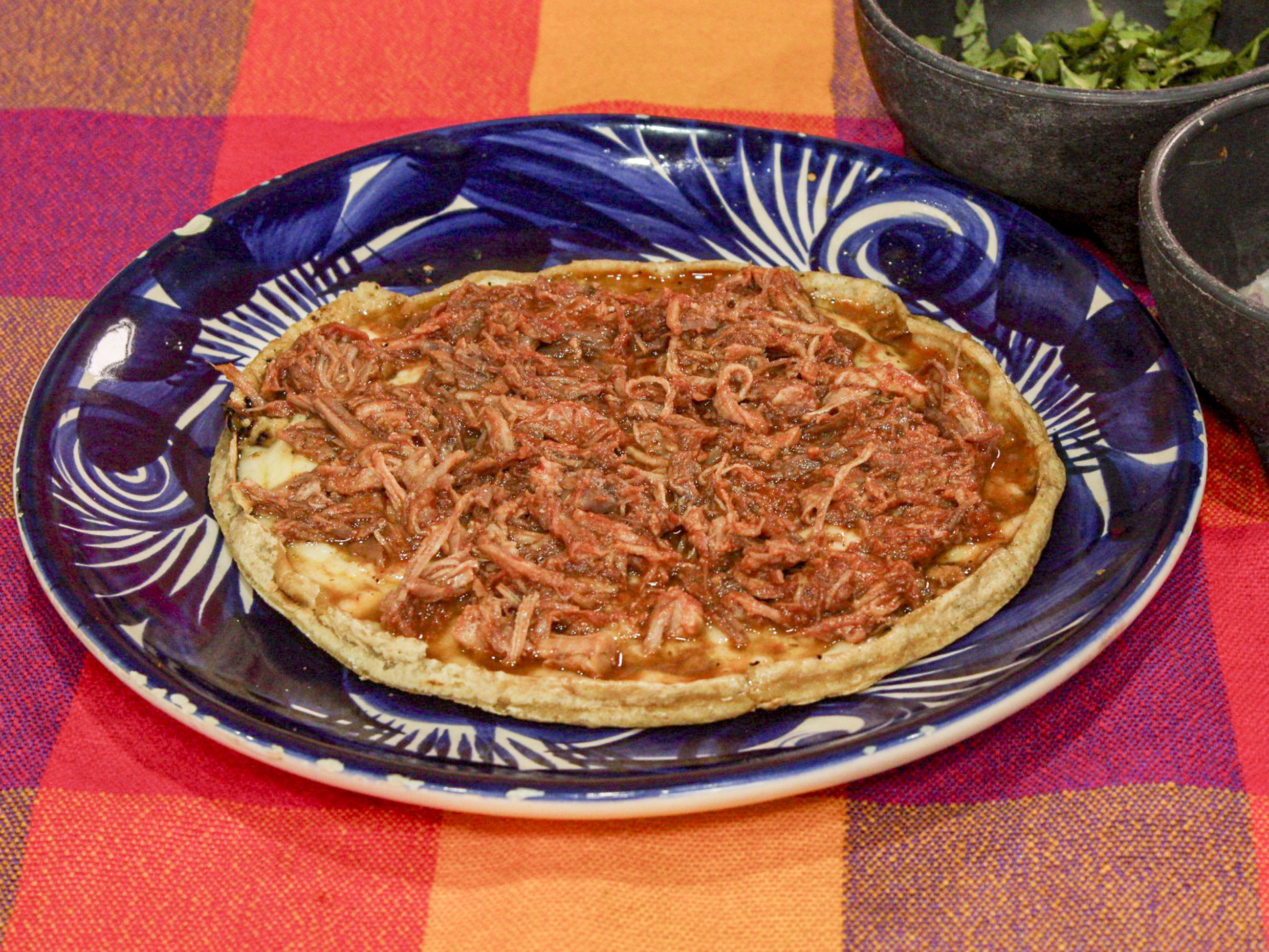 tortilla de maiz, pellizcado en sus orilla, con relleno de birria