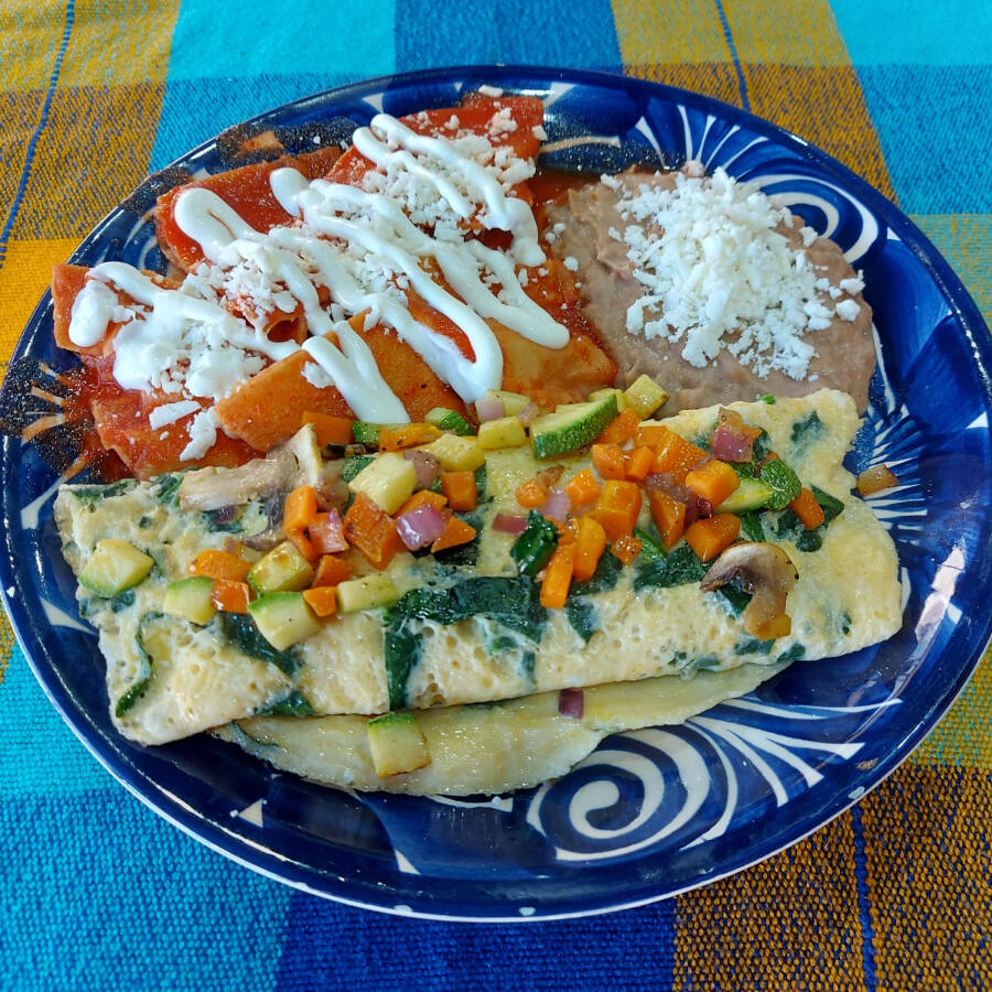 Con Espinaca Champiñón Pimiento y verduras salteadas acompañado de chilaquiles y frijolitos