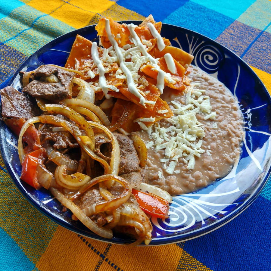 Acompañada de frijoles y chilaquiles.