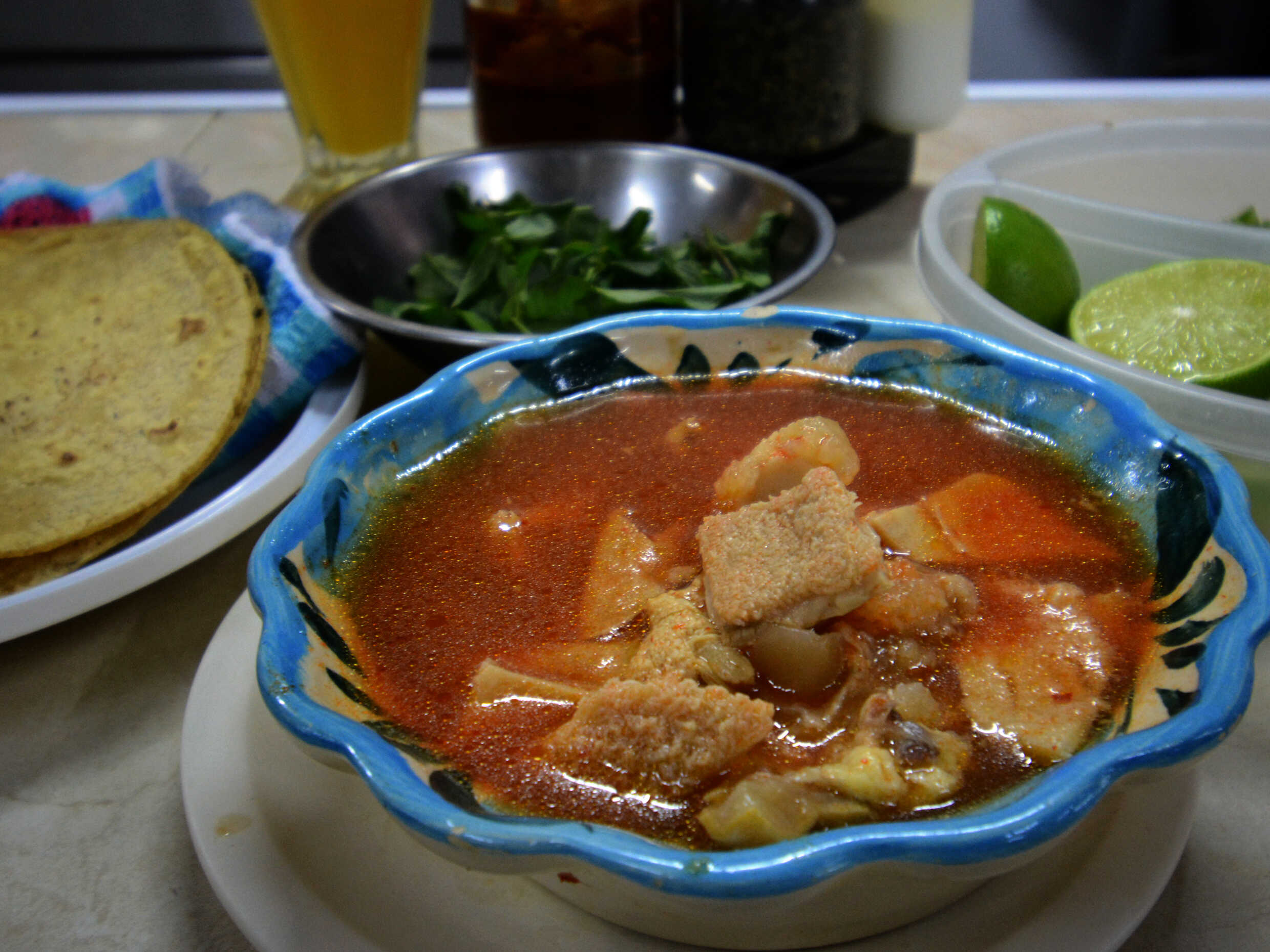 Delicioso menudo acompañado con tortillas recién hechas, hierbabuena, cebolla, chile serrano y limón.