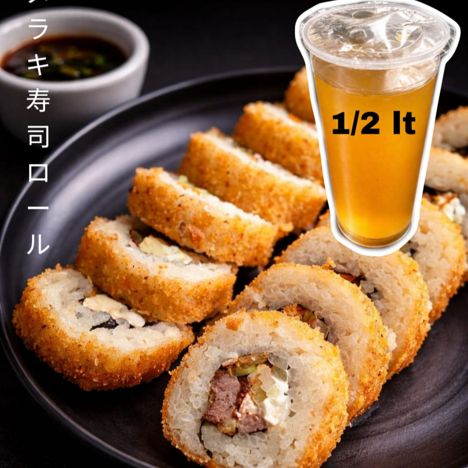 Rollo empanizado . Por dentro , camarón , res , philadelphia, aguacate , pepino y zanahoria