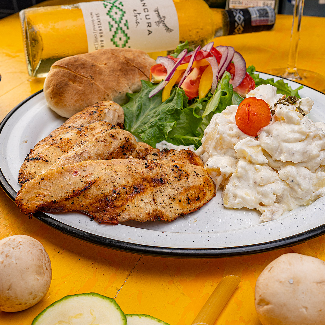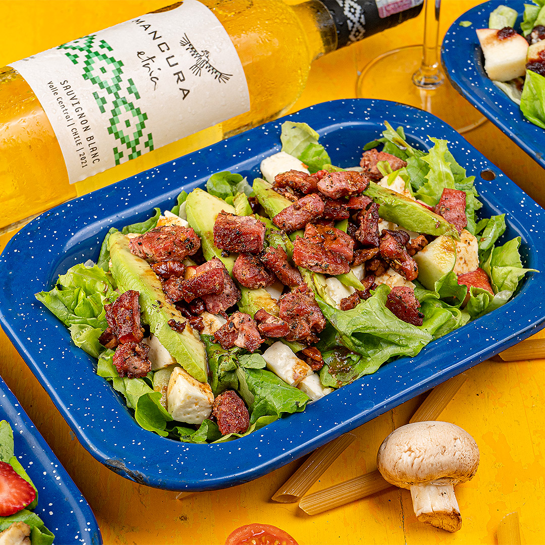 Mezcla de finas lechugas, pollito asado, panela fresca, nuez, fresa y bañada en vinagreta de chabacano. 240 g.