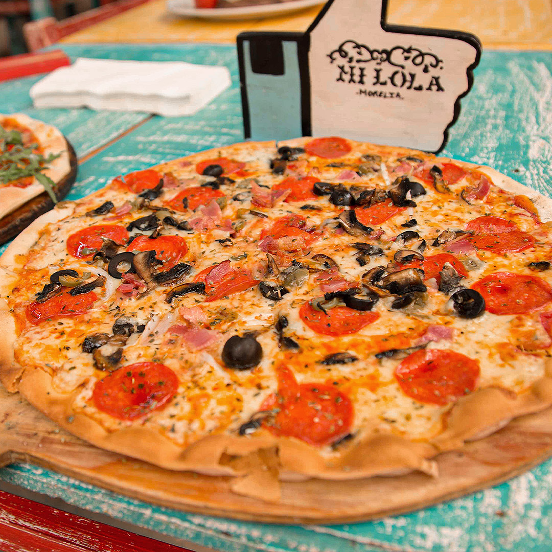 Queso mozzarella, pepperoni, tocino, aceitunas mixtas, cebolla y champiñones frescos.