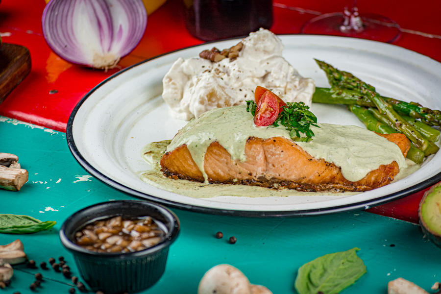 Deliciosa lonja de salmón bañado de suave crema de albahaca. 220 g.