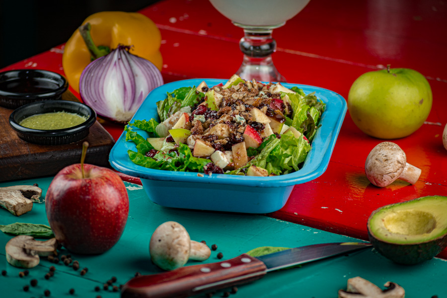 Mezcla de finas lechugas, manzana, nuez pecana, arándanos, queso azul, panela fresca y vinagreta dulce de grosella. 240 g.