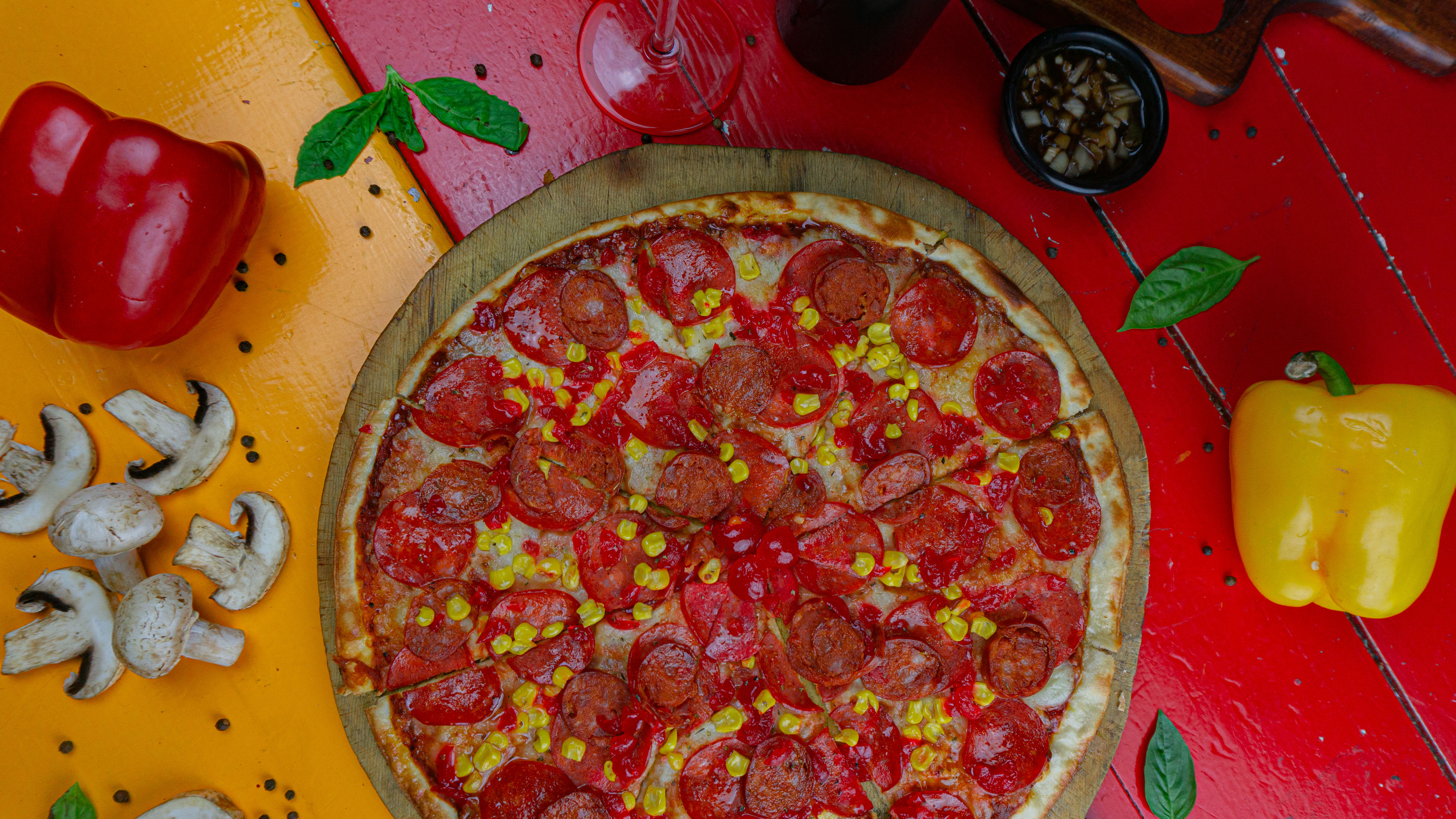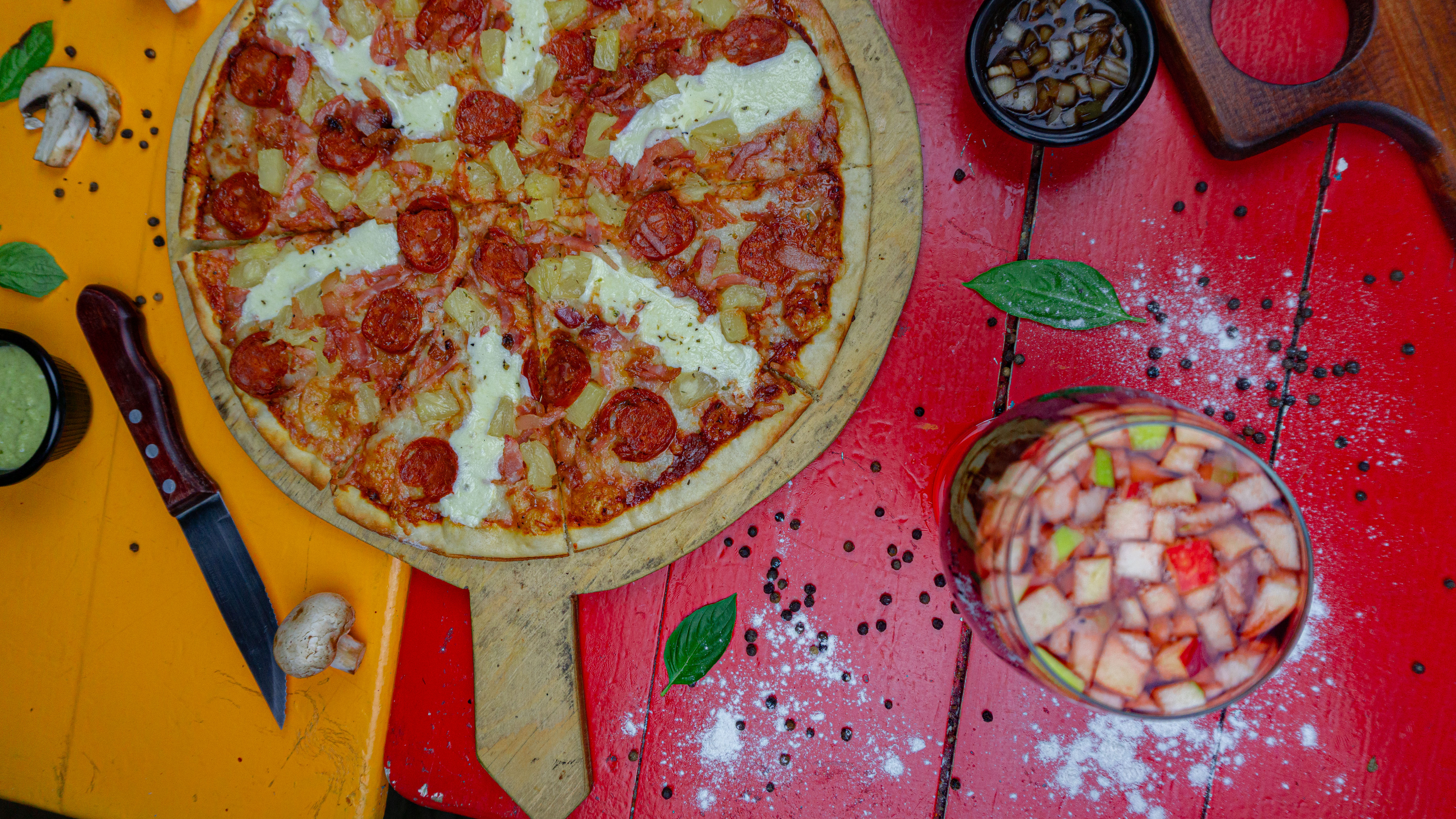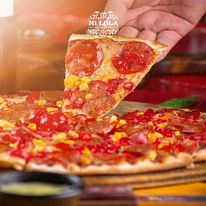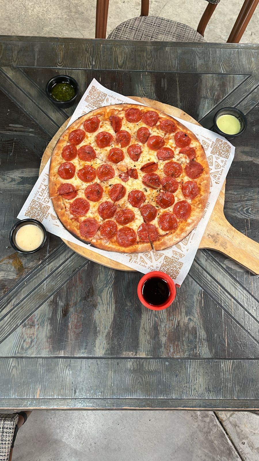 Deliciosa pizza a la Leña con peperoni acompañada de salsas tradicionales de la casa