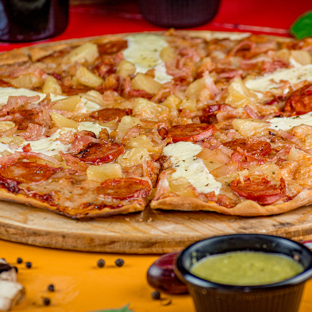 Queso mozzarella, salami, morrón, tocino, cebolla y piña.