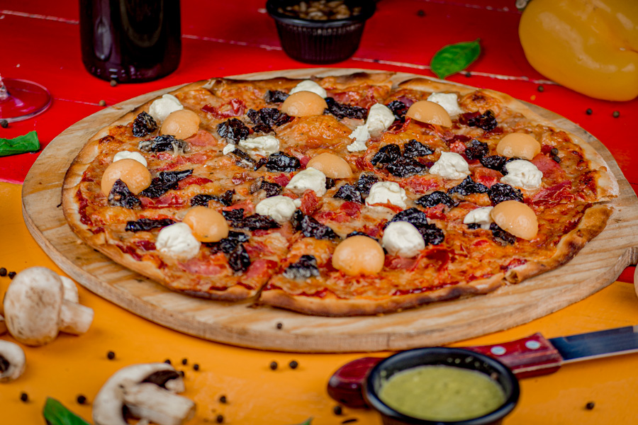 Queso mozzarella, camarón, tocino, champiñones, cebolla y albahaca.