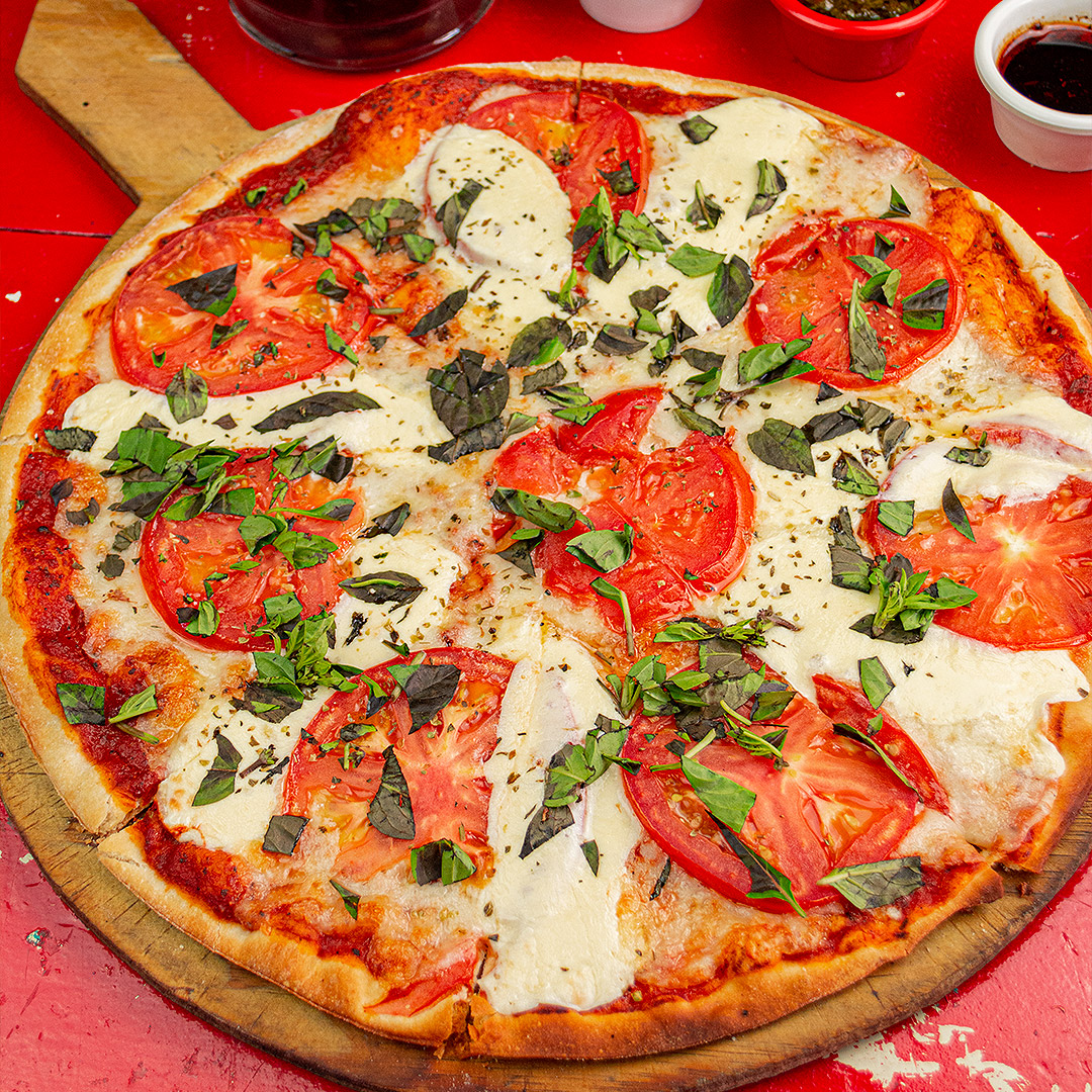 Clásica pizza italiana dedicada a la reina Margherita di Savola. Queso mozzarella, tomate, mozzarella, albahaca fresca, espolvoreada de orégano seco.