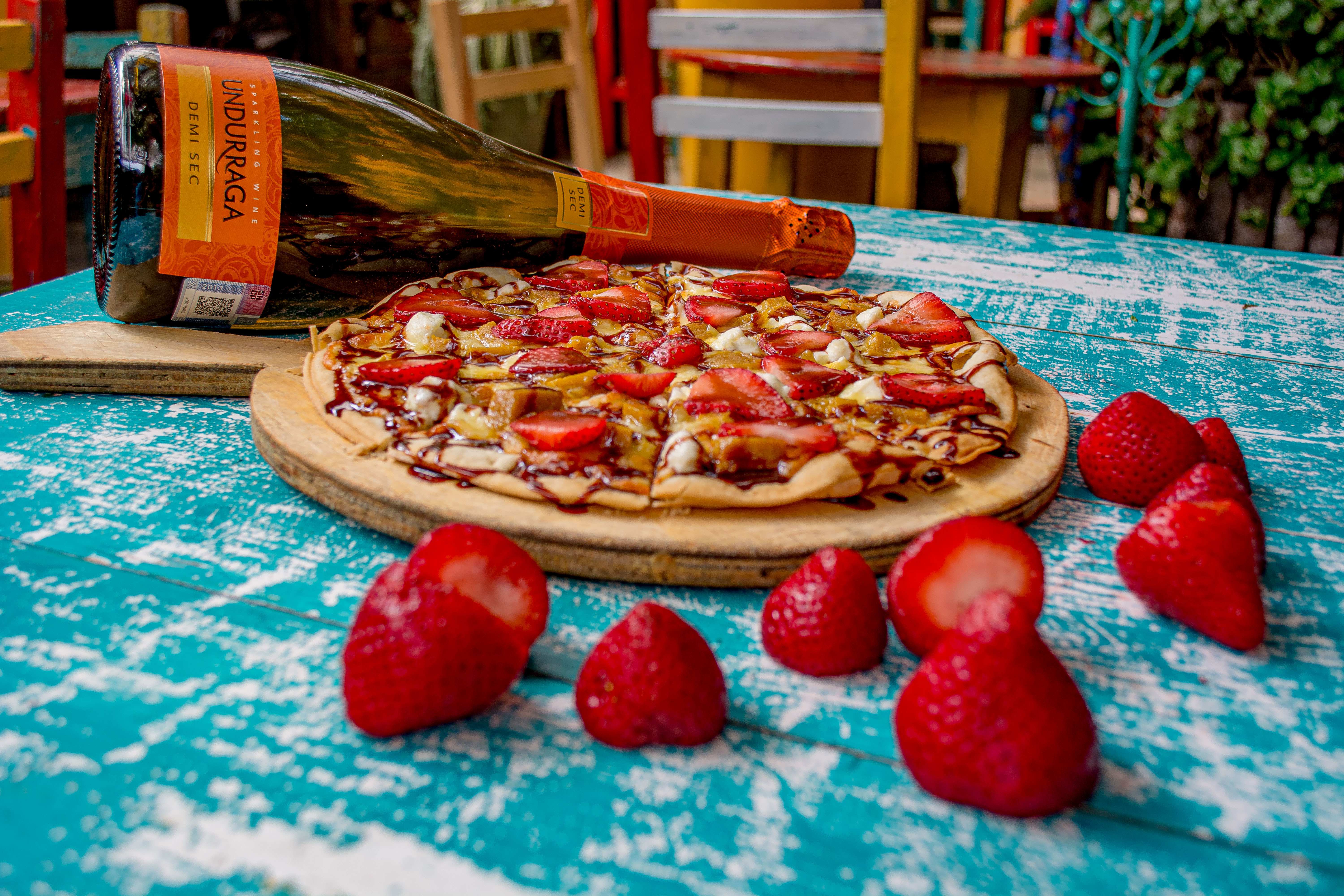 Deliciosa pizza dulce (25 cm), 300 g, queso gouda, queso crema, ate de membrillo, fresa y chocolate líquido.
