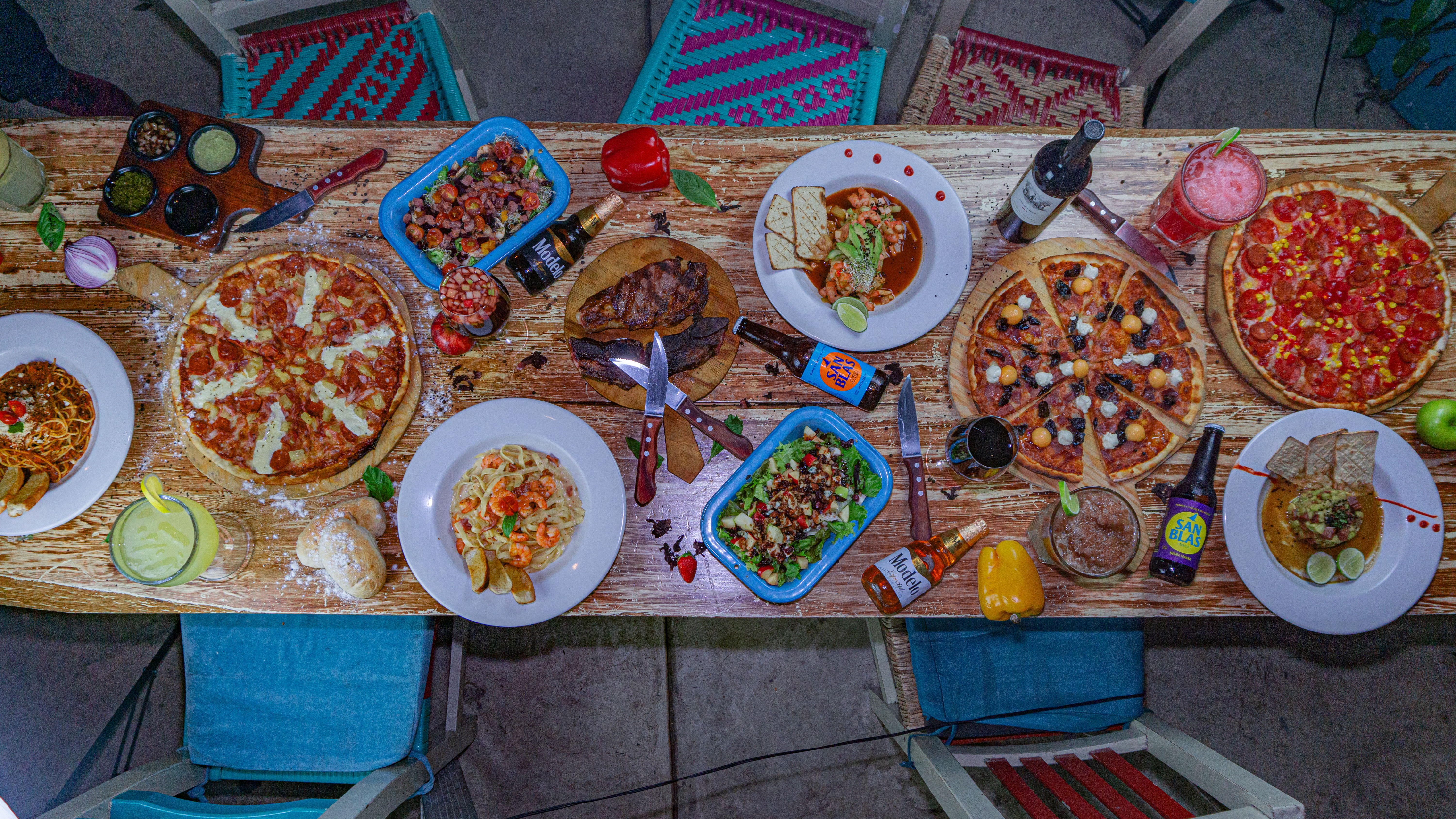Queso mozzarella, camarón, chorizo, calabaza, elote y cebolla.