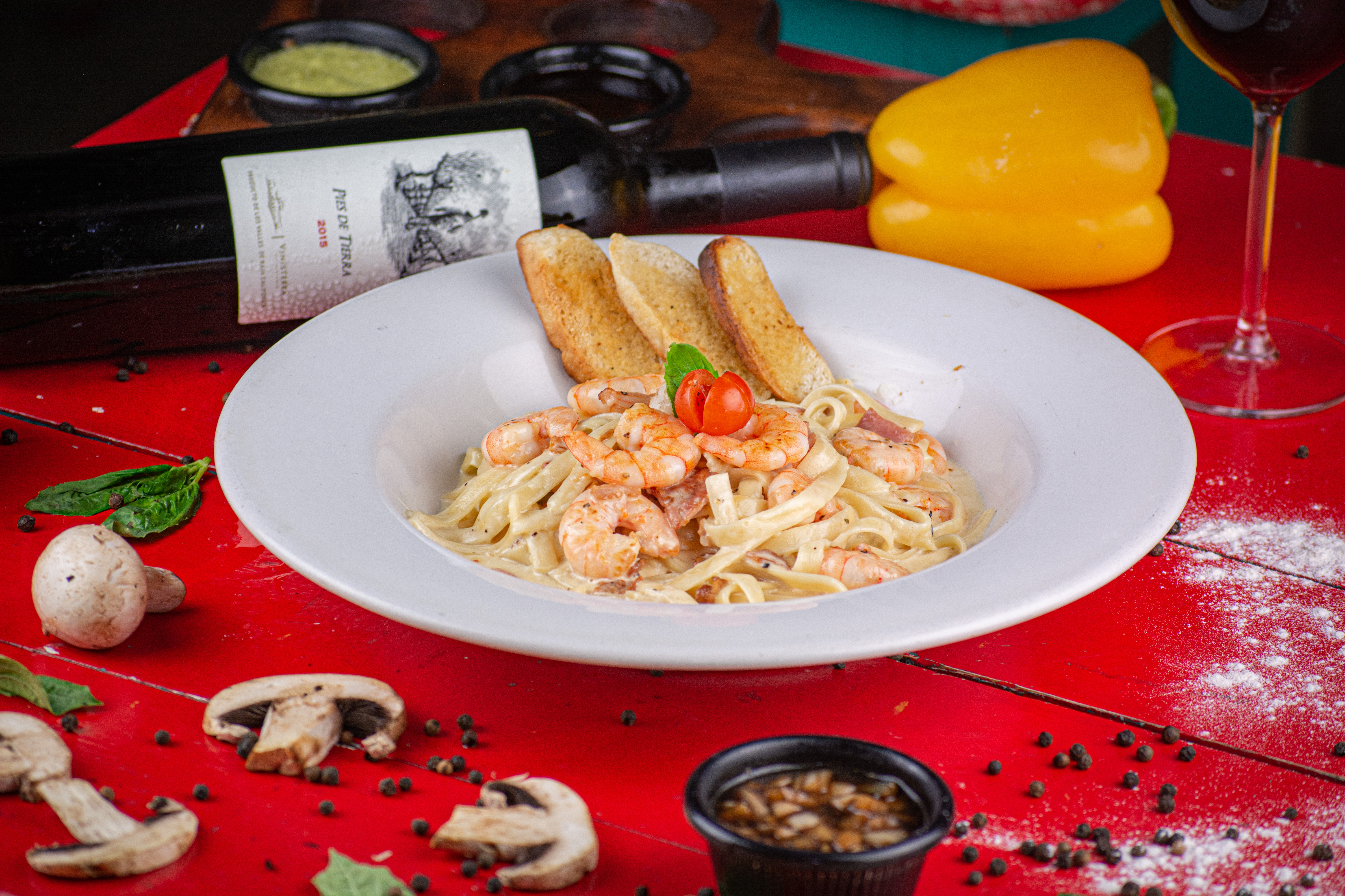 Delicioso fetuccini con camarones guisados con brandy al ajo, tocino albahaca fresca y bañada con salsa de crema casera. 350 g.