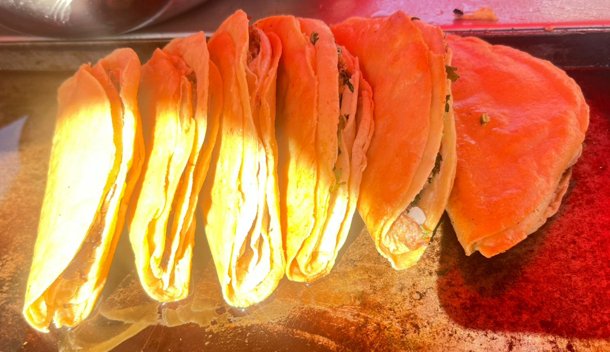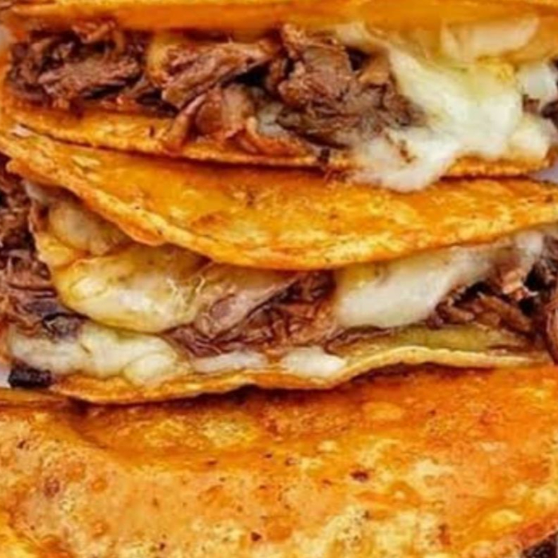 Es el punto medio entre taco dorado y quesabirria: tortilla dorada en grasa con carne y queso derretido por dentro.