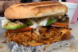Pan telera o bolillo artesanal, ligeramente crujiente por fuera y suave por dentro, relleno de pierna de cerdo horneada y deshebrada. Se complementa con mayonesa, frijoles refritos, láminas de aguacate, jitomate, cebolla y chiles en vinagre para el toque final.