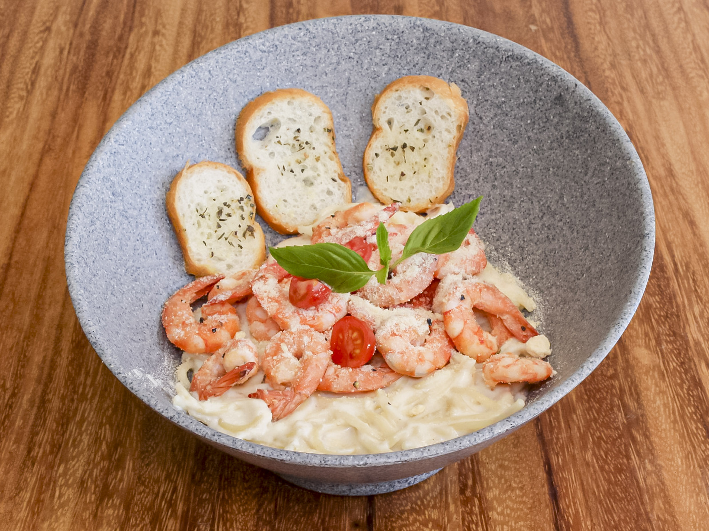 Pasta fetuccini en una exquisita salsa de quesos, coronada con unos deliciosos camarones al ajillo y un polvo de queso parmesano.