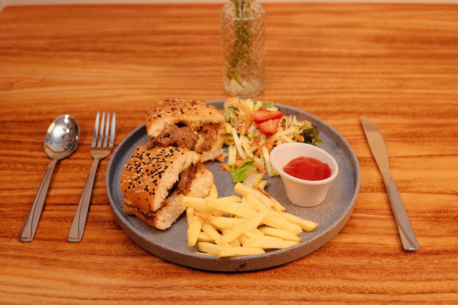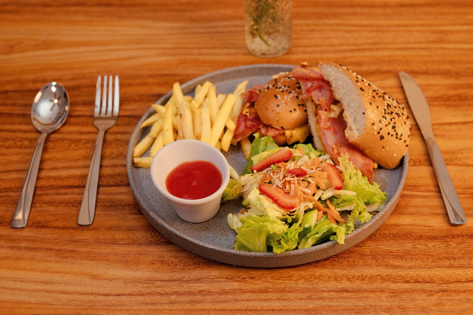 Jamón, tocino, queso mozzarella, ensalada, papas y aderezo de la casa.