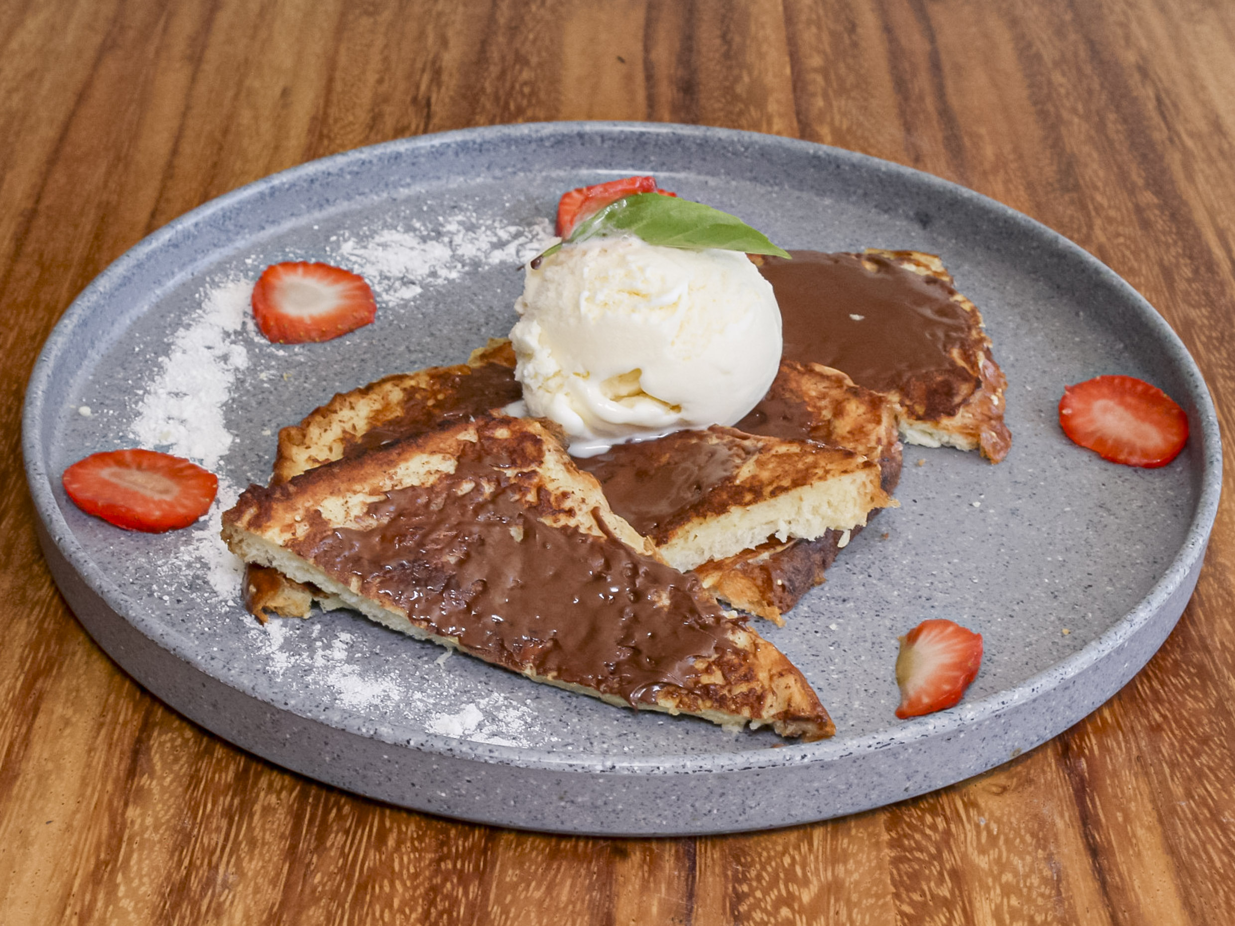 4 Piezas. De pan de caja. Coronados con nutella, fresas, almendra y nieve.