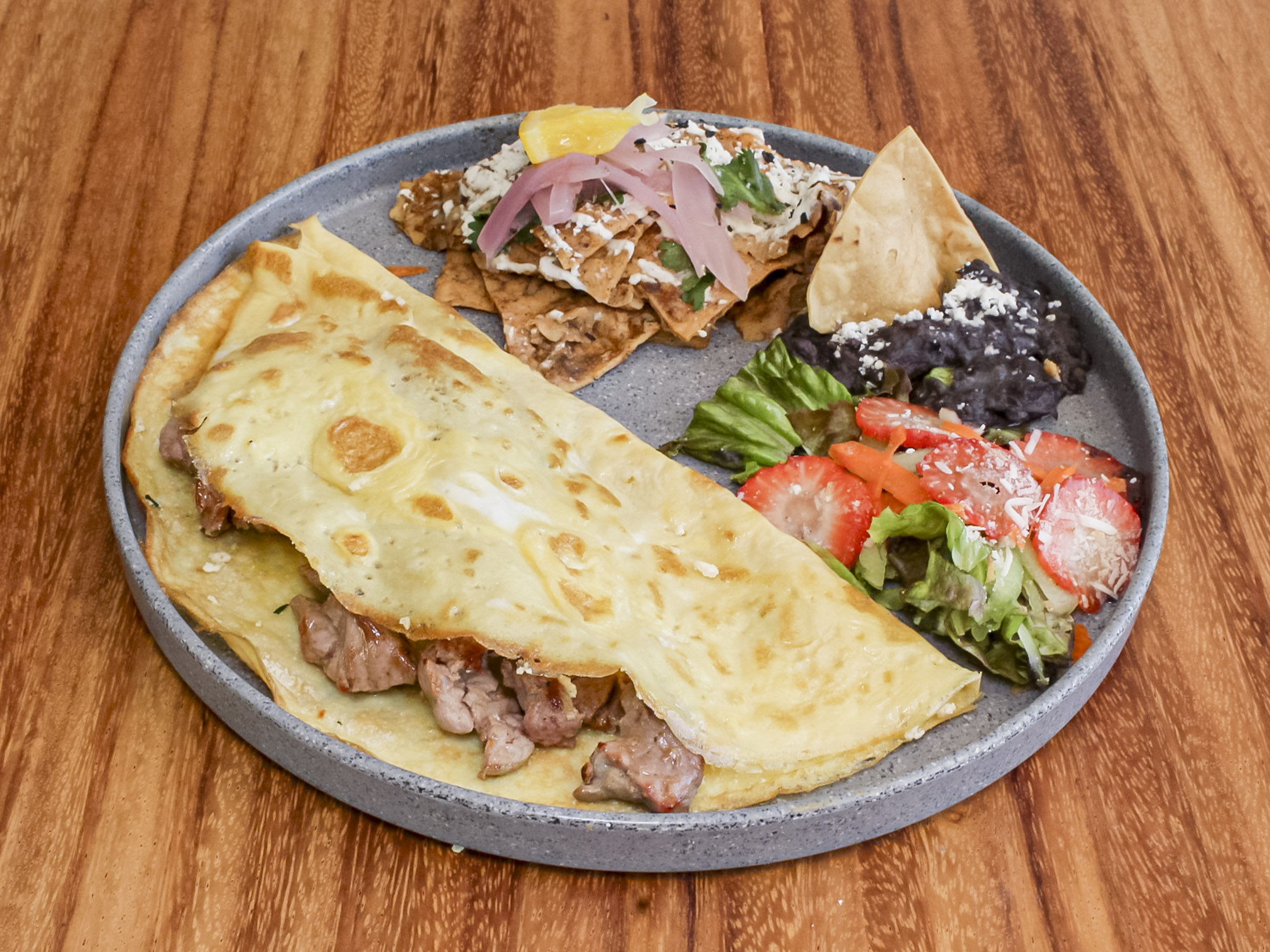 Relleno de arrachera, queso mozzarella, acompañados de frijoles, ensalada y chilaquiles.