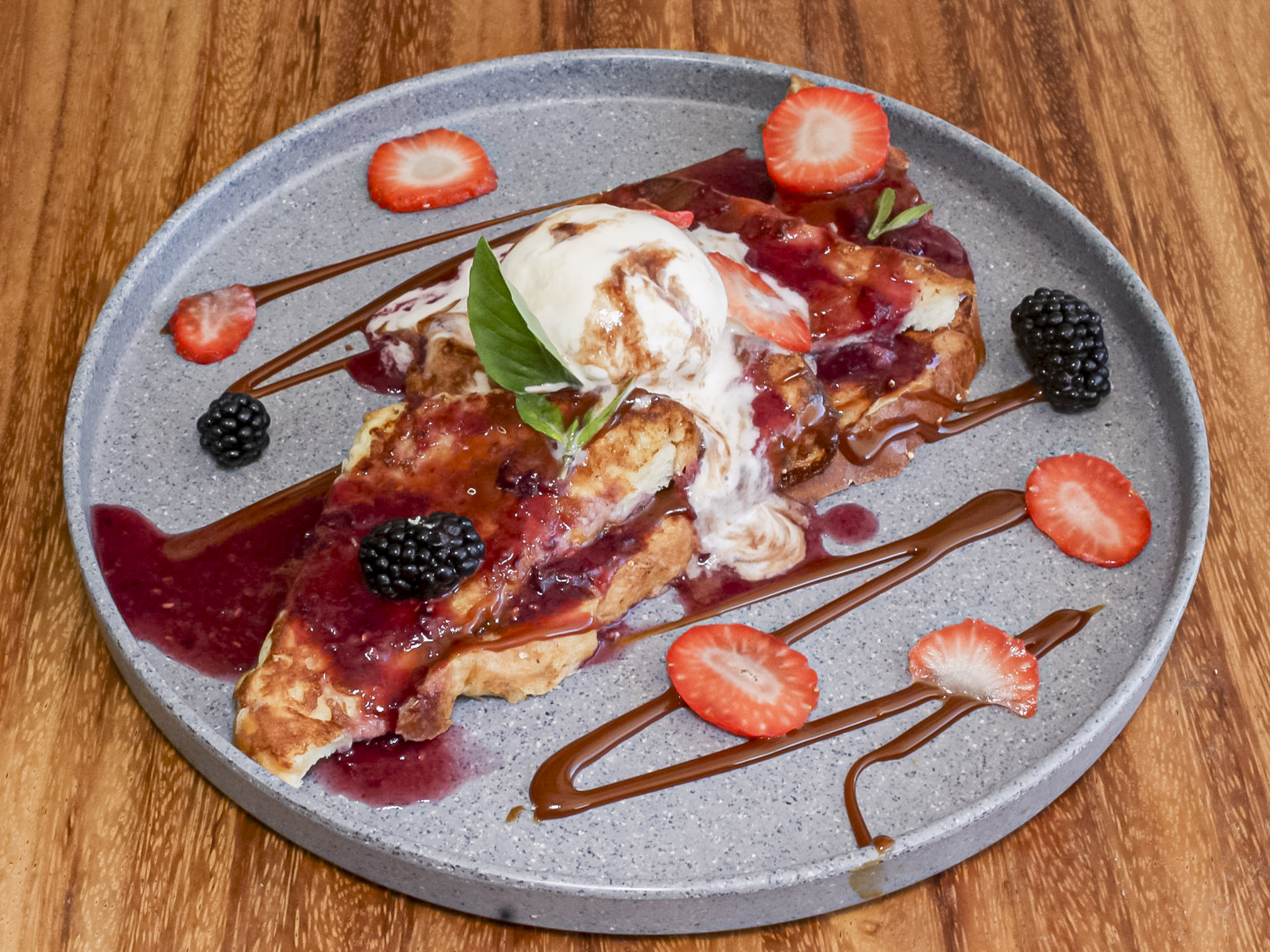 (Especialidad de la casa) 2pzas. Coronadas con un cremoso de café, frutos rojos frescos y nieve.