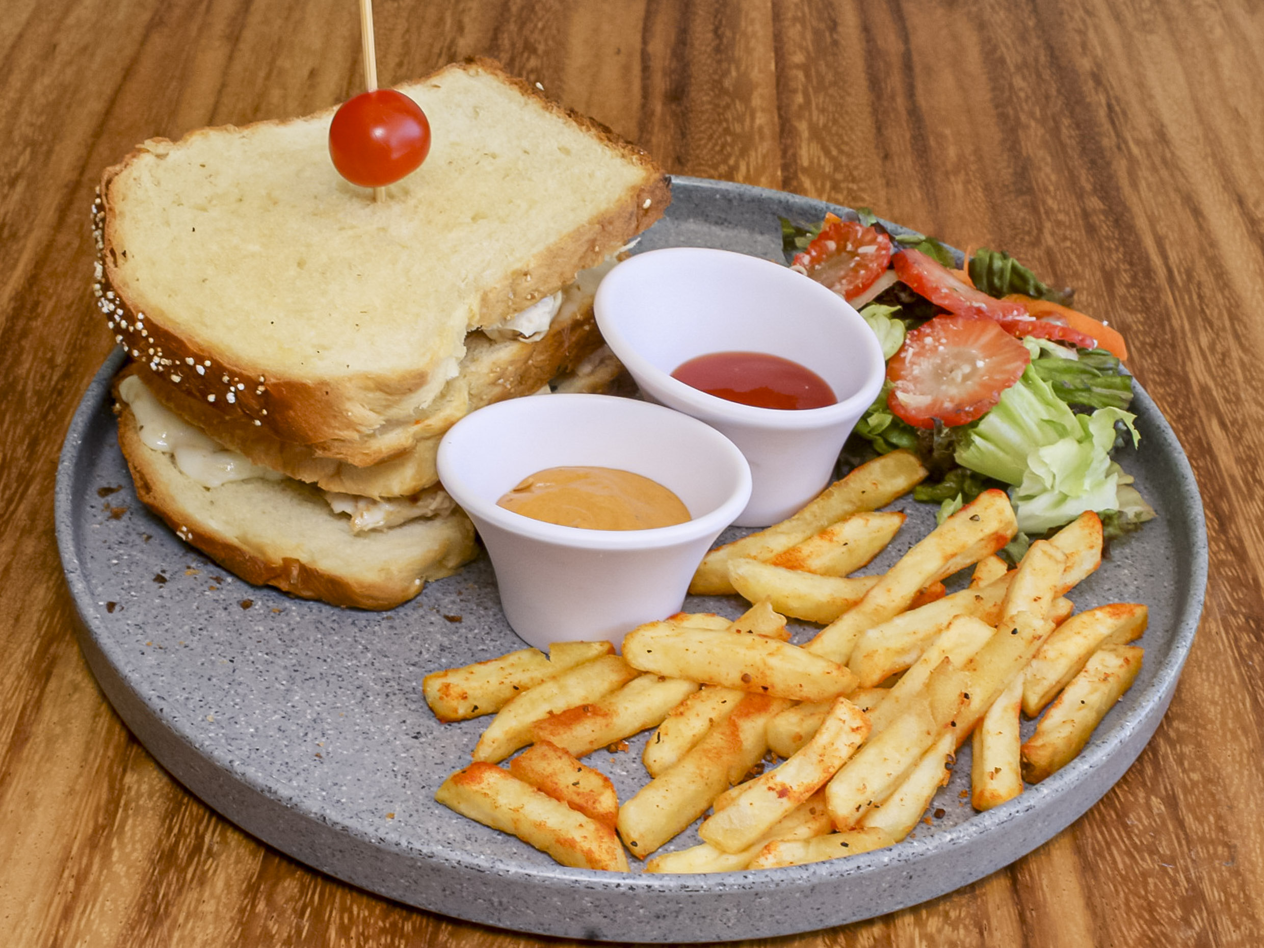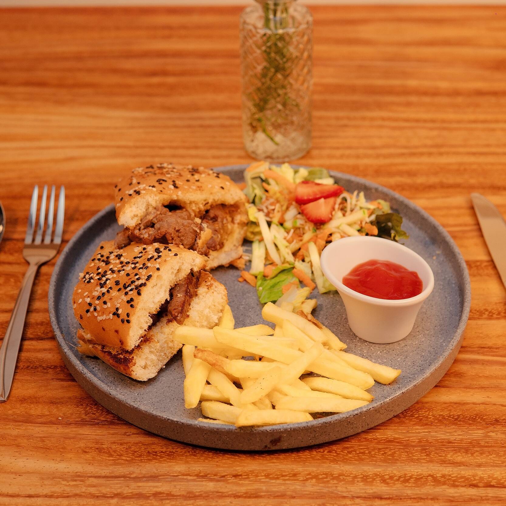 Dos tapas de pan brioche, coronadas con pollo a la plancha, aderezo de la casa y cebollita encurtida.