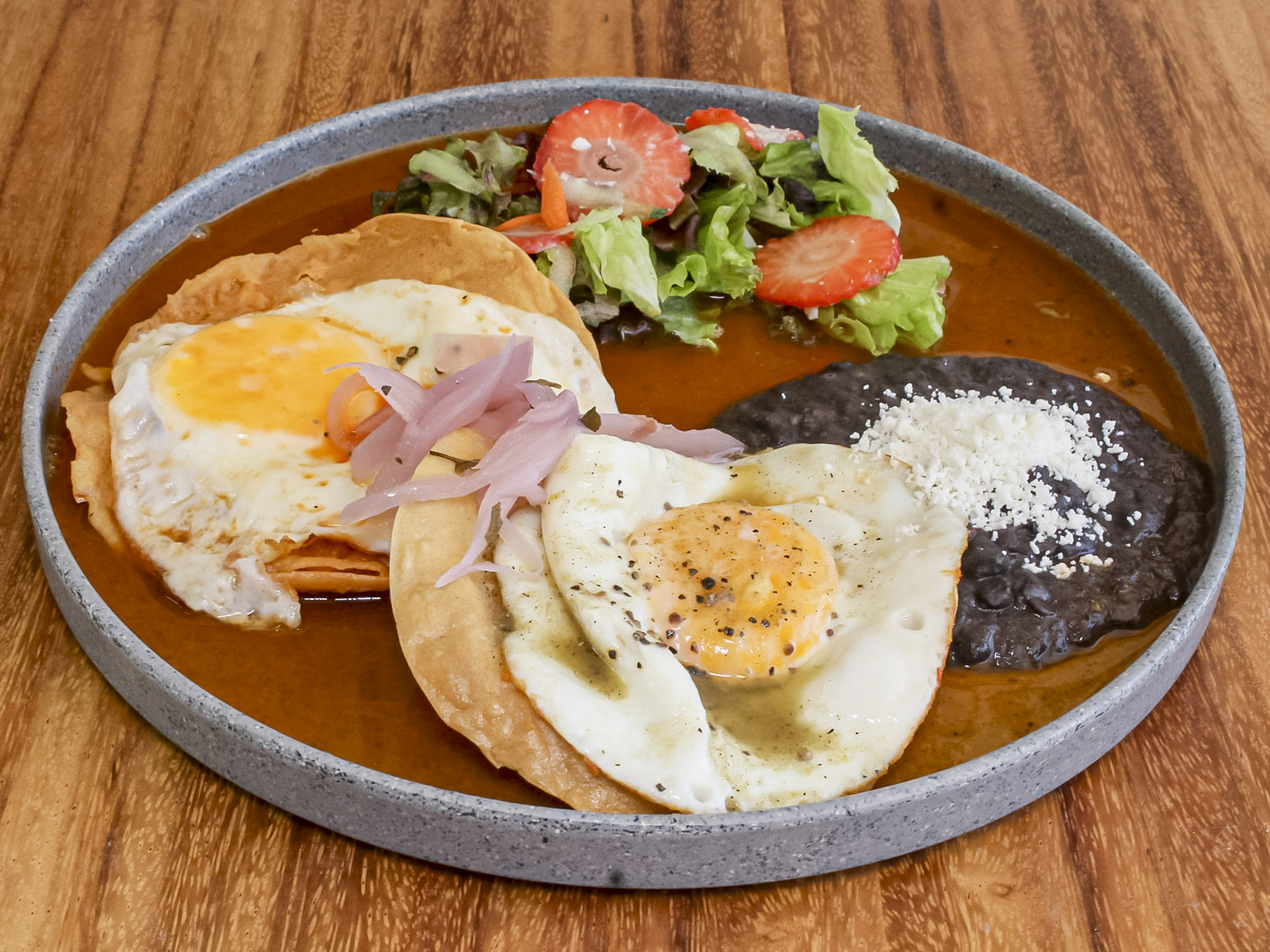Dos tostadas, coronadas con huevo estrellado, bañadas con salsa tatemada, acompañadas de frijoles, ensalada y chilaquiles.
