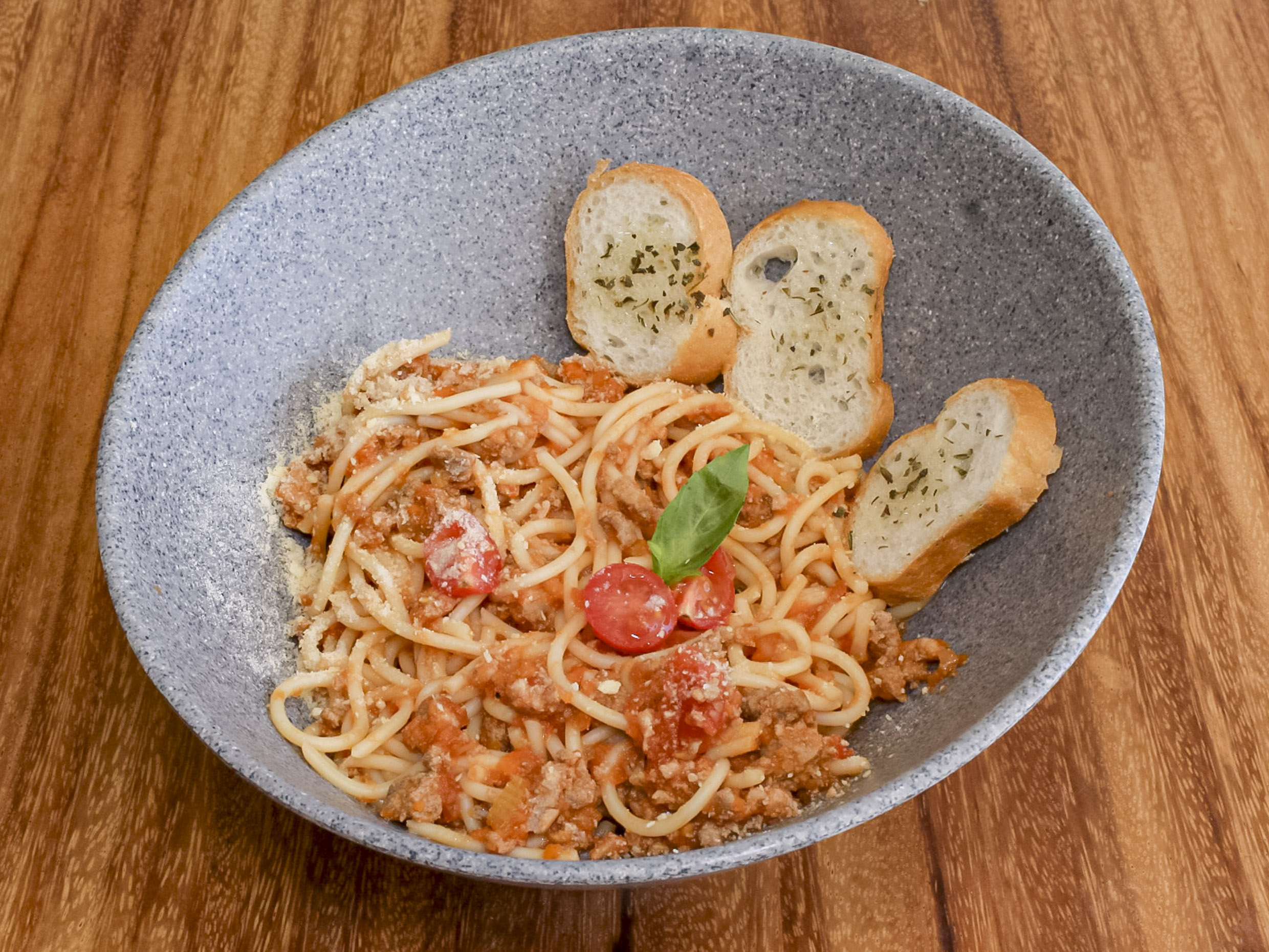 Deliciosa pasta tradicional de Boloña spaguetti, con carne a la boloñesa y un polvo de queso parmesano.