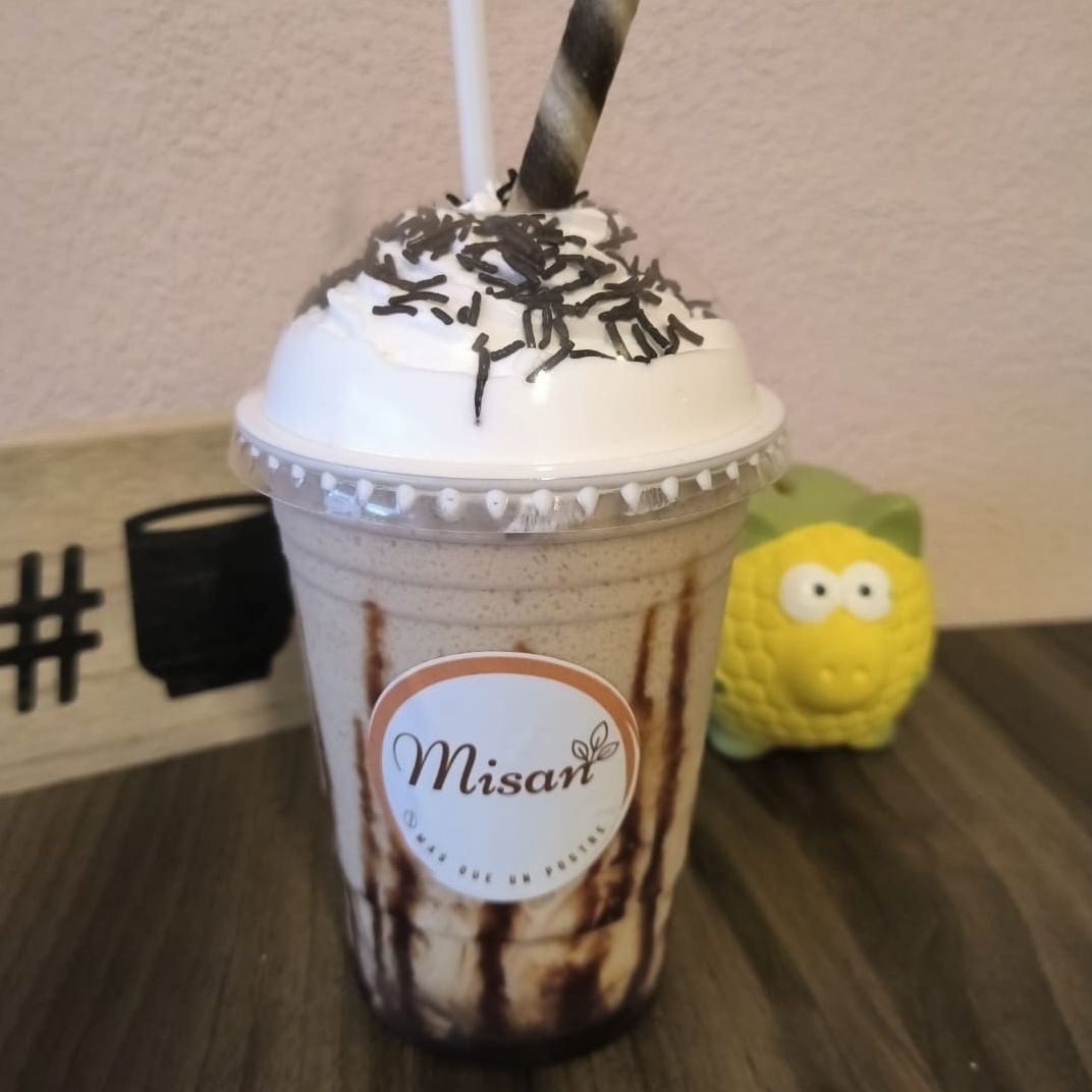 Rico Frappé sabor café con oreo con topping de crema batida, Galleta oreo y salsa de chocolate en vaso de 16 oz