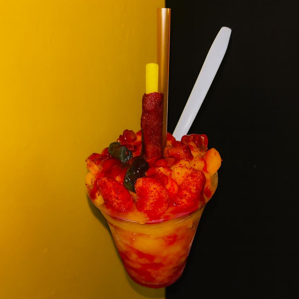 Rico smothie de fruta natural, acompañado con chamoy y gomitas.