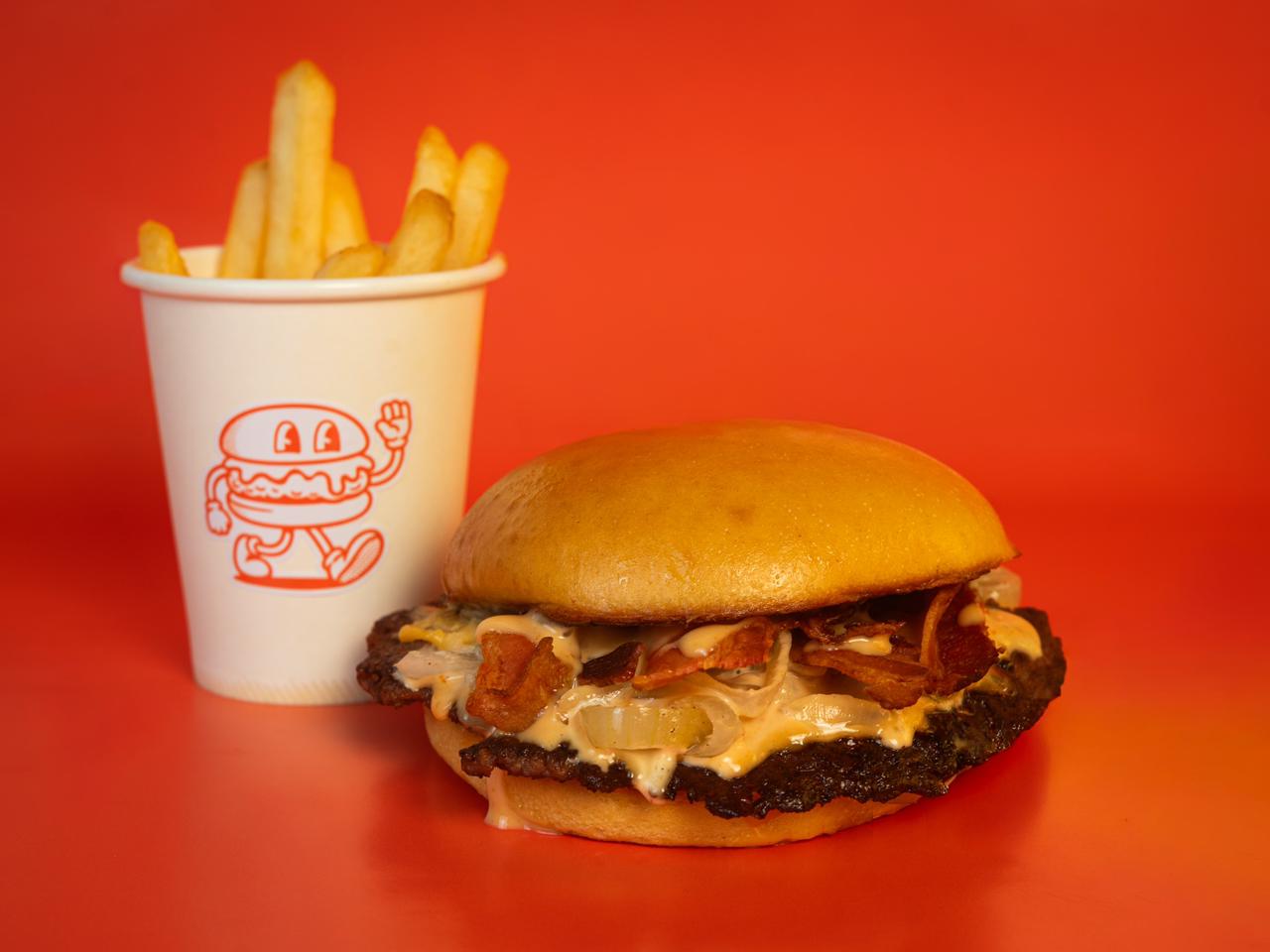 Hamburguesa con doble carne 100% picaña, con pan brioche, aderezo de la casa, tocino y cebolla caramelizada.