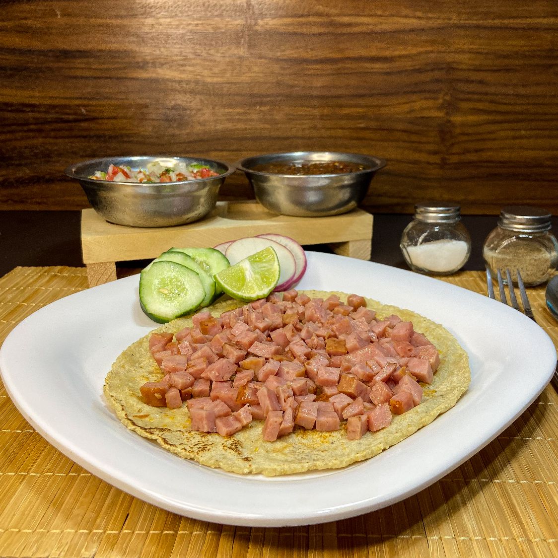 Tortilla de tamano grande 100% de maiz. Con deliciosa carne de chuleta.