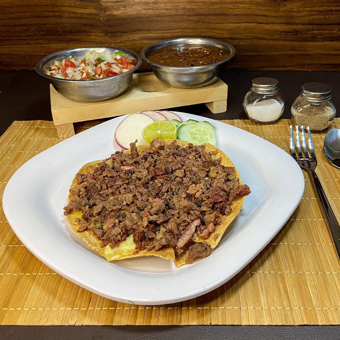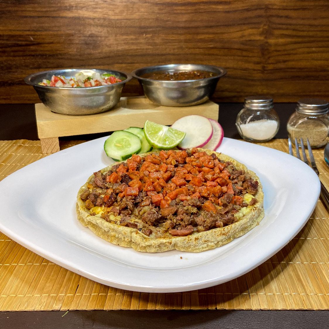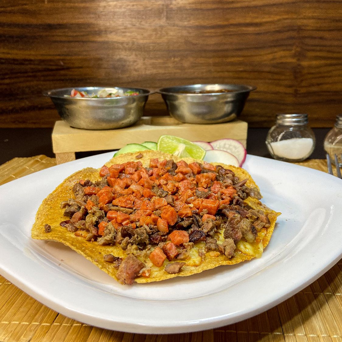 Delisiosa carne a su eleccion sobre una cama de queso para fundir y tortilla a elegir: Harina o Maiz.