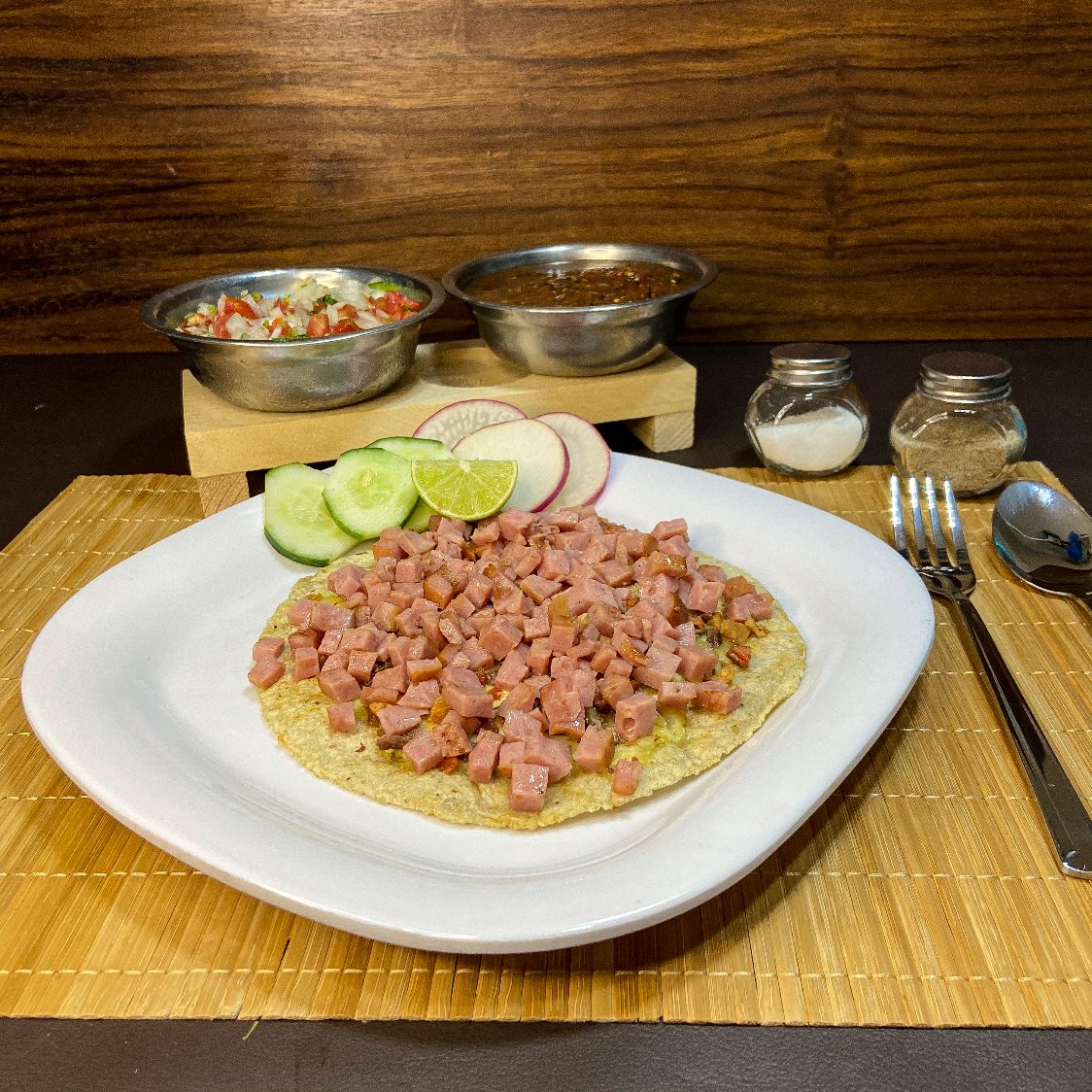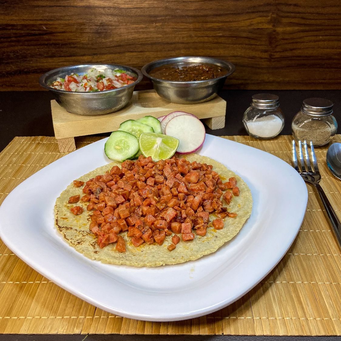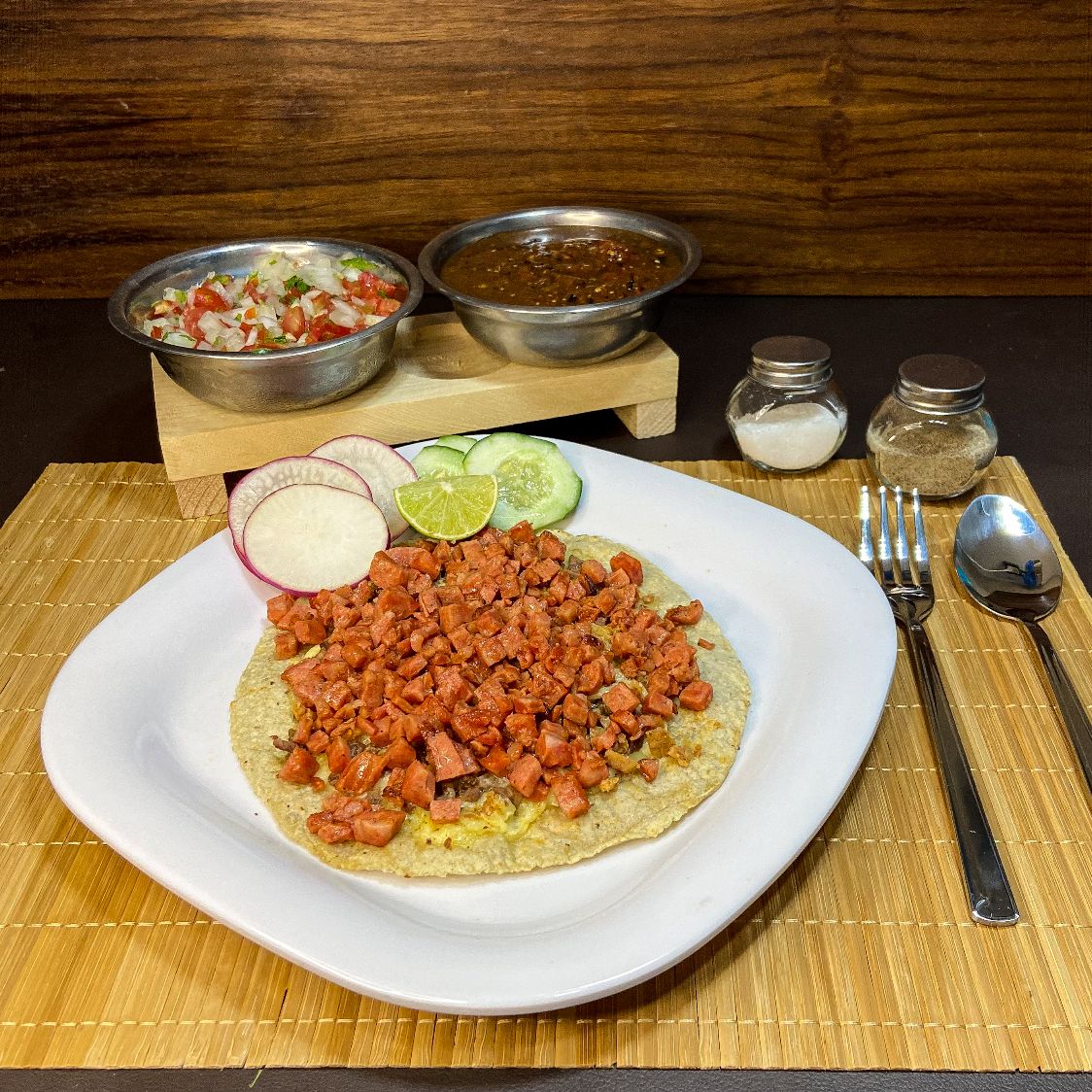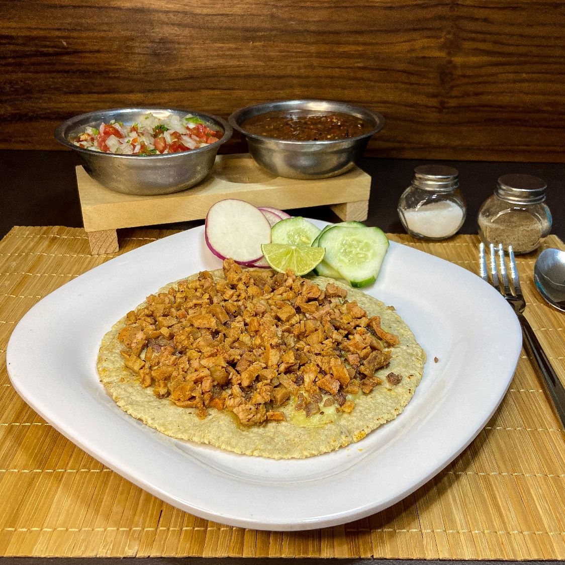 Delisiosa carne de adobada(tipo pastor) sobre una cama de queso para fundir y tortilla a elegir: Harina o Maiz.