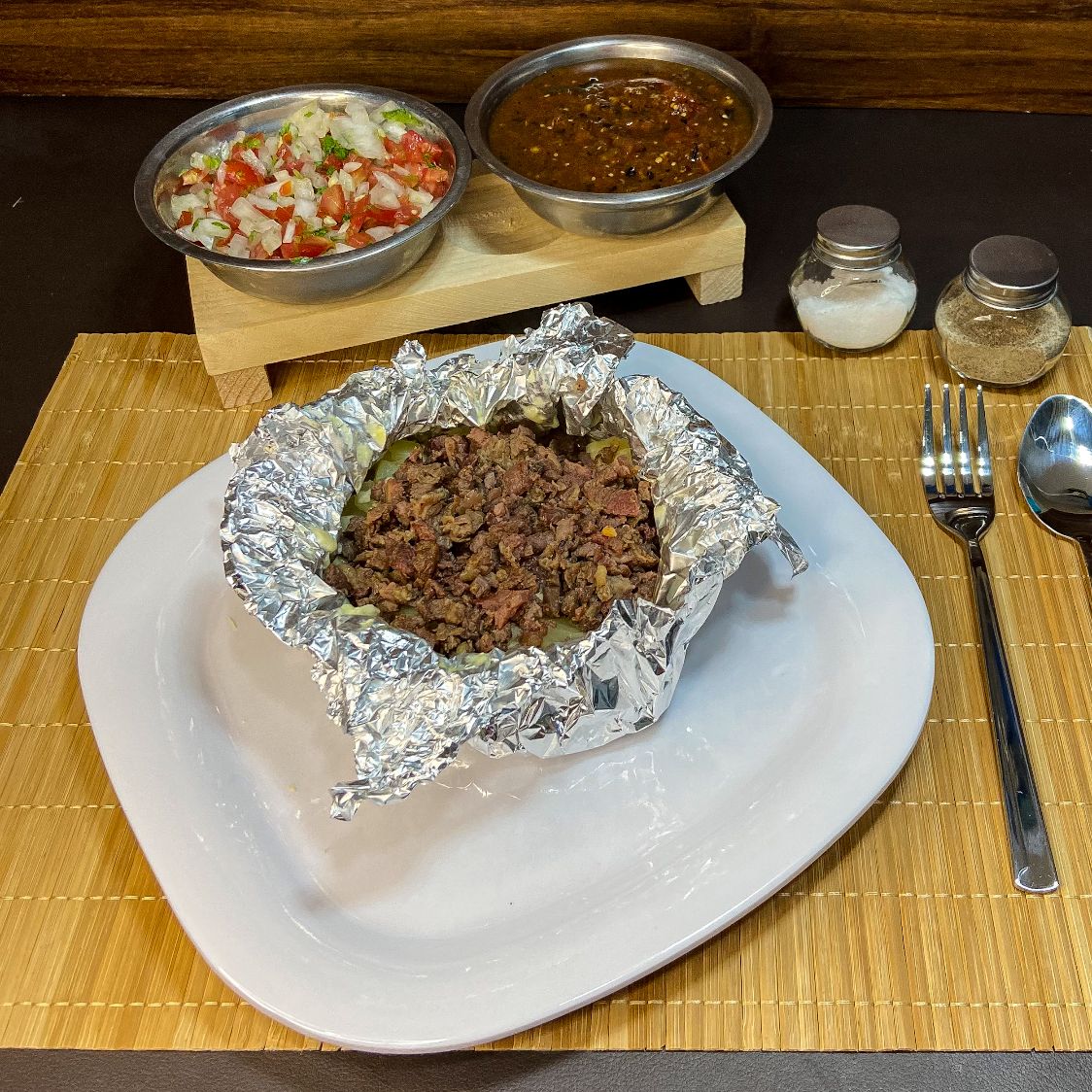 papa cocida, delicioso queso garatinado y la receta de la casa. Con 2 tipos de delisiosa carne a tu elección. Incluye 3 tortillas.