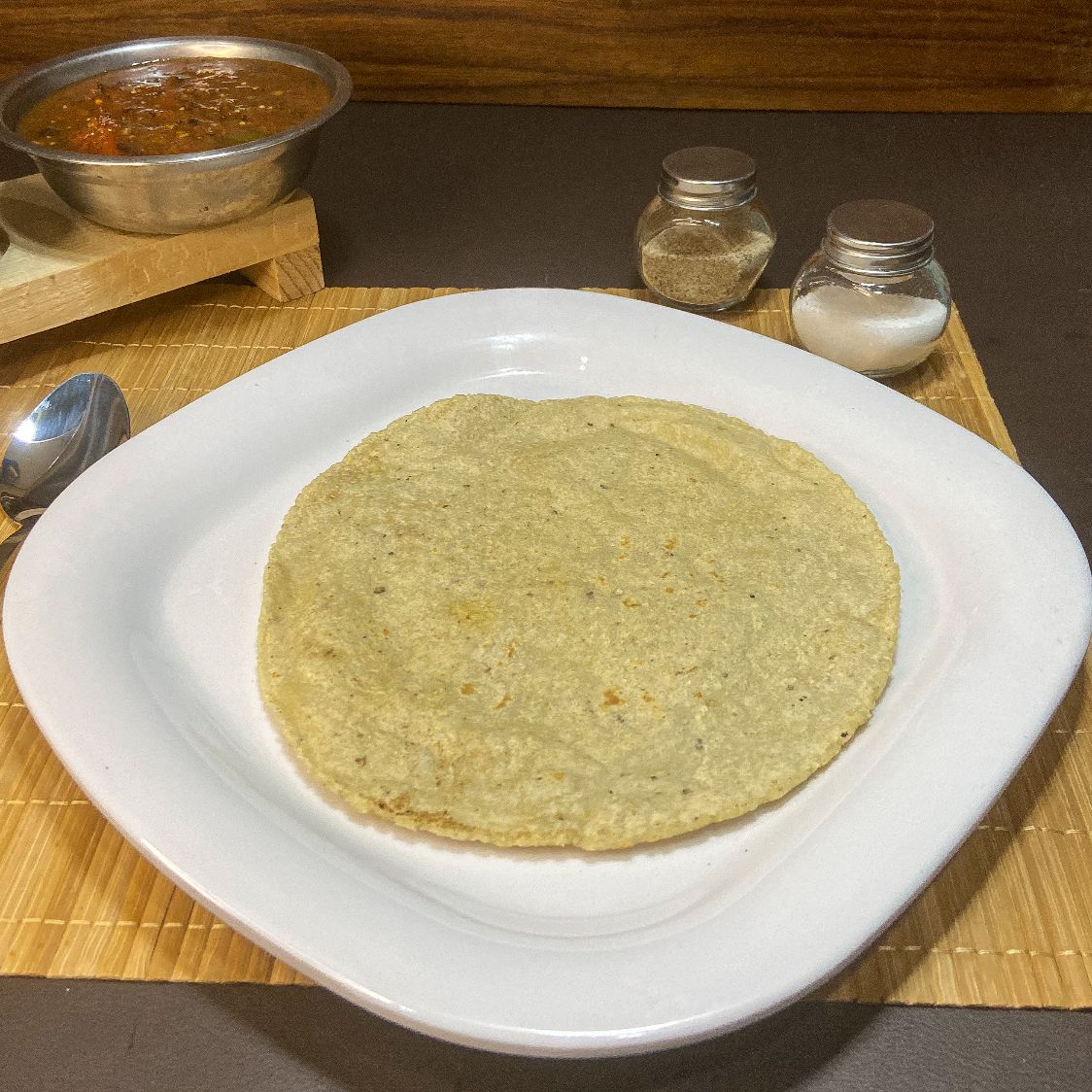 Tortilla grande deshidratada (Dorada a fuego lento en horno) con una cama queso garatinado.