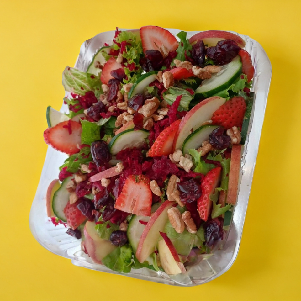 Base: lechuga más espinaca, fresa, manzana verde, cebolla morada, betabel rallado, nuez más granola. Proteína de elección: panela o pollo 130 g. Incluye aderezo ranch y vinagreta mostaza miel.