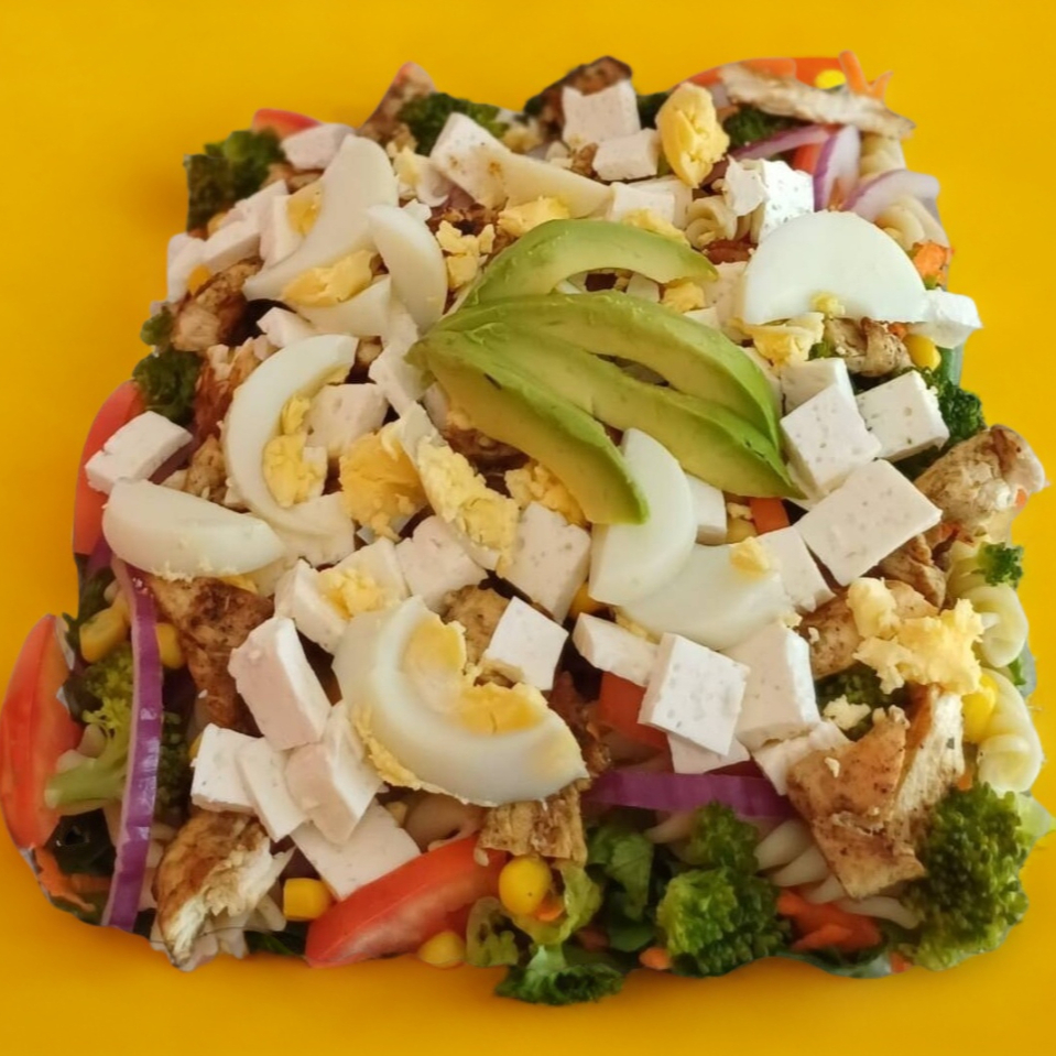Base: lechuga más zanahoria rallada, 1/2 taza de pasta cocida, granos de elote, jitomate, pimiento morrón, cebolla morada, brócoli cocido, aguacate. Incluye 3 proteínas (huevo cocido, 85 g de pollo a la plancha, 65 g de panela), acompañada de 1 aderezo ranch más otro a elección.