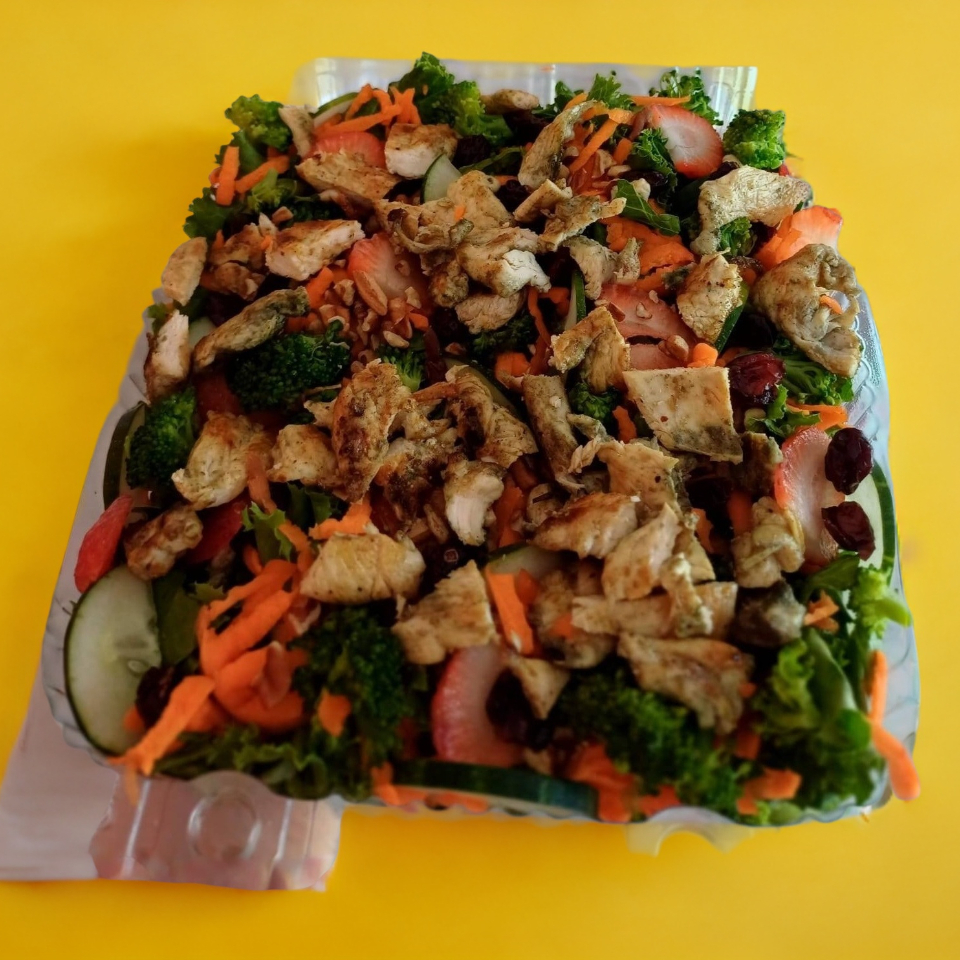 Base lechuga, zanahoria rallada, pimiento morrón, fresa, nuez y arándano, 90 g de pechuga de pollo a la plancha. Incluye crotones y 1 ranch más otro aderezo a elegir.
